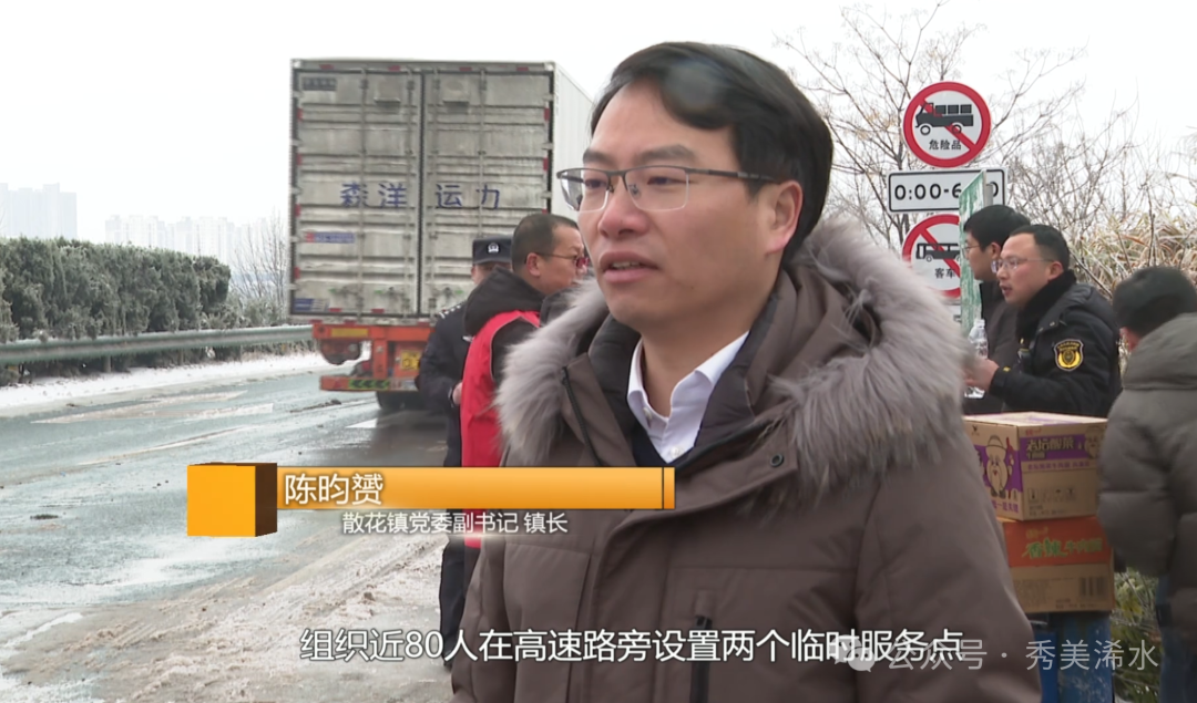散花镇党委副书记 镇长 陈昀赟:散花镇组织近80人在高速路旁设置两个临时服务点,执法中心的干部负责疏导交通,其他干部提供开水和食物,共计提供近600份。