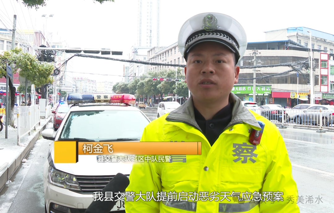 县交警大队城区中队民警 柯金飞:为全力降低恶劣天气带来的不利影响,我县交警大队提前启动恶劣天气应急预案。全警上路,多措并举,全力开展路面巡查、指挥疏导、排查隐患等工作。确保辖区道路交通整体畅通有序,努力为群众创造良好的道路交通出行环境。