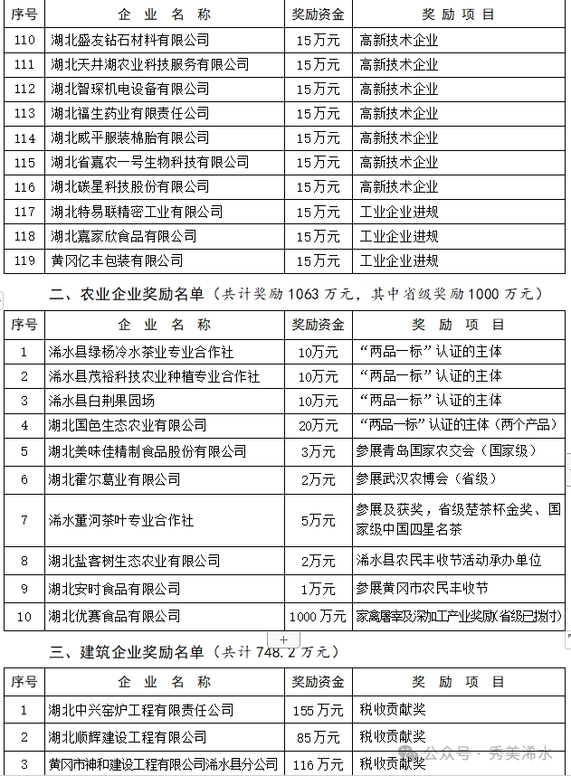2.对湖北优赛食品有限公司、湖北国色生态农业有限公司、浠水县绿杨冷水茶业专业合作社等10家农业企业和农民专业合作社实行奖励,共计1063万元。