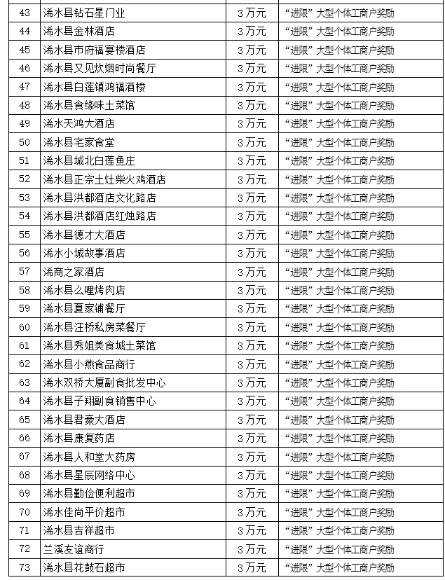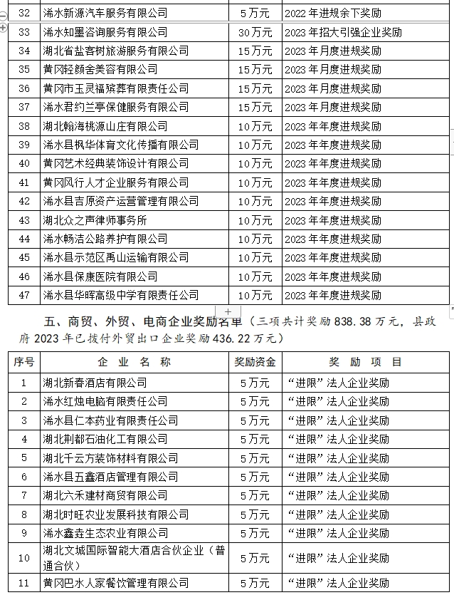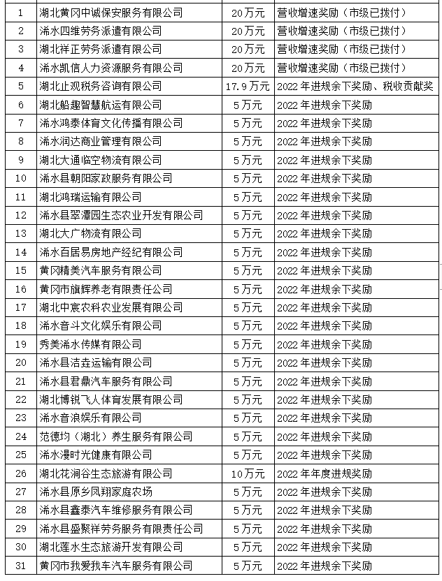 4.对浠水知墨咨询服务有限公司、湖北黄冈中诚保安服务有限公司、浠水四维劳务派遣有限公司等47家服务业企业实行奖励,共计427.9万元。