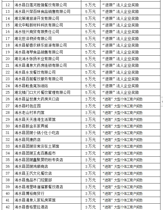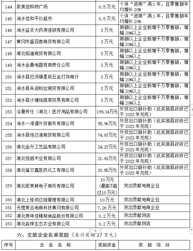 5.对湖北新春酒店有限公司、洛曼劳仕(湖北)医疗用品有限公司、湖北家美鲜电子商务有限公司等163家商贸、外贸、电商企业和个体工商户实行奖励,共计838.38万元。