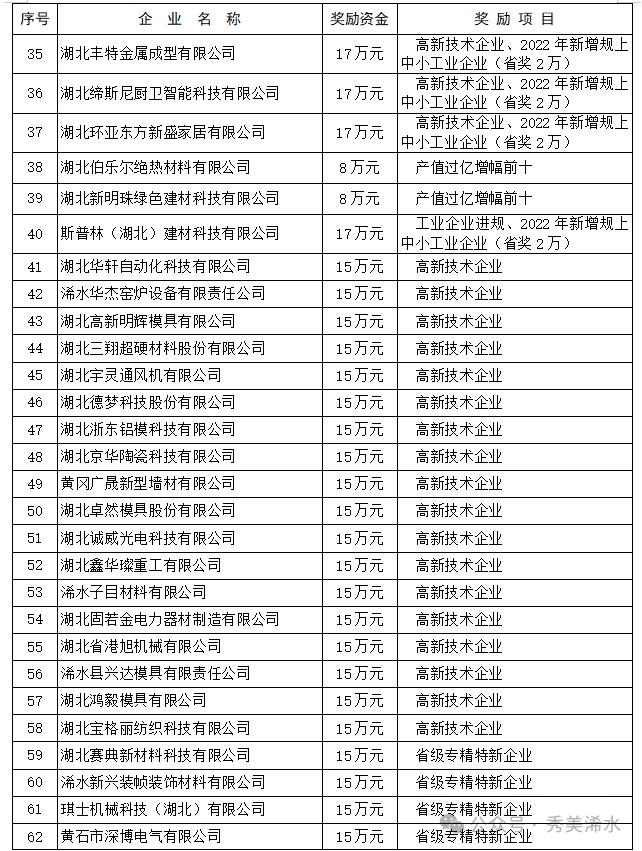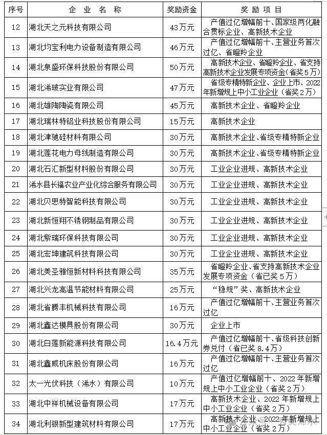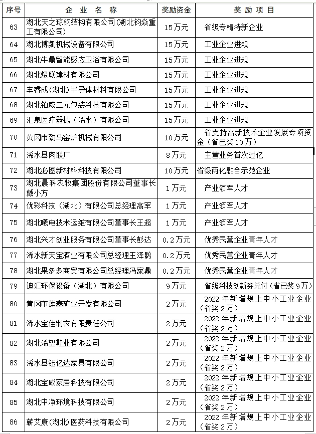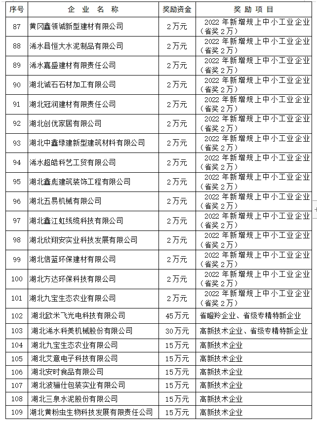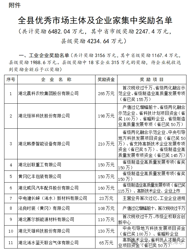 1.对湖北晨科农牧集团股份有限公司、湖北恒祥科技股份有限公司、湖北韩泰智能设备有限公司等119家工业企业实行奖励,共计3156万元。