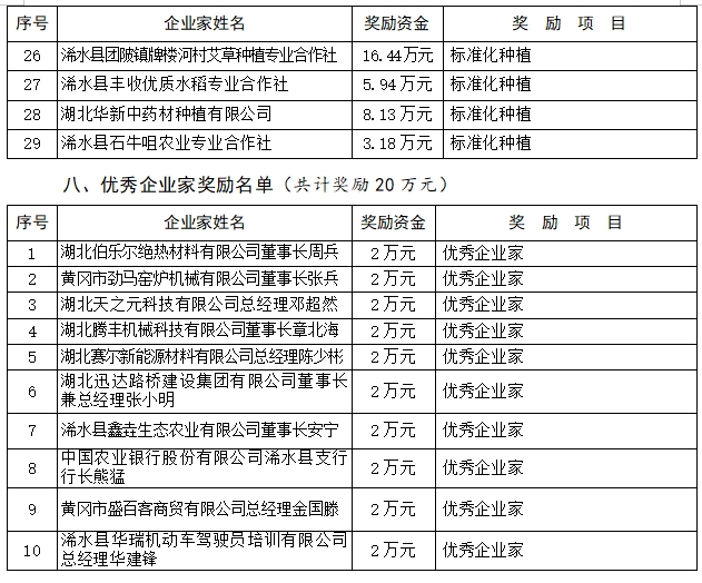8.对湖北伯乐尔绝热材料有限公司董事长周兵、黄冈市劲马窑炉机械有限公司董事长张兵、湖北天之元科技有限公司总经理邓超然等10名优秀企业家实行奖励,共计20万元。