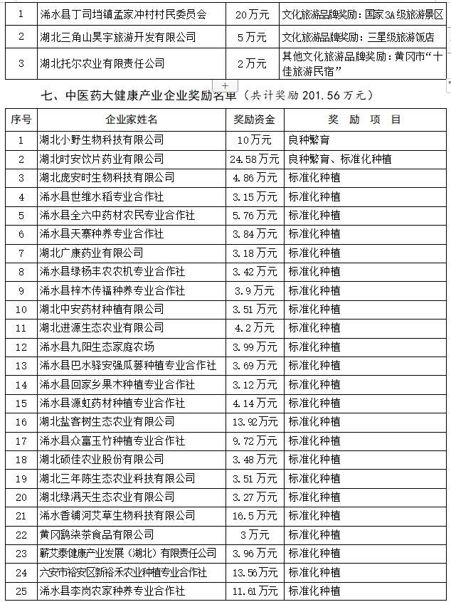 7.对湖北小野生物科技有限公司、湖北时安饮片药业有限公司、浠水香铺河艾草生物科技有限公司等29家中医药大健康产业企业和合作社实行奖励,共计201.56万元。