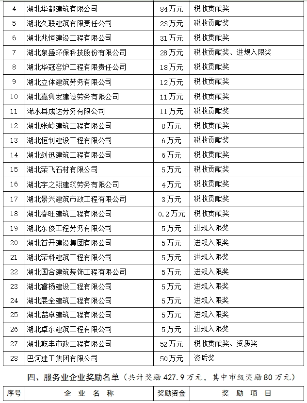 3.对湖北中兴窑炉工程有限责任公司、黄冈市神和建设工程有限公司浠水县分公司等28家建筑企业实行奖励,共计748.2万元。