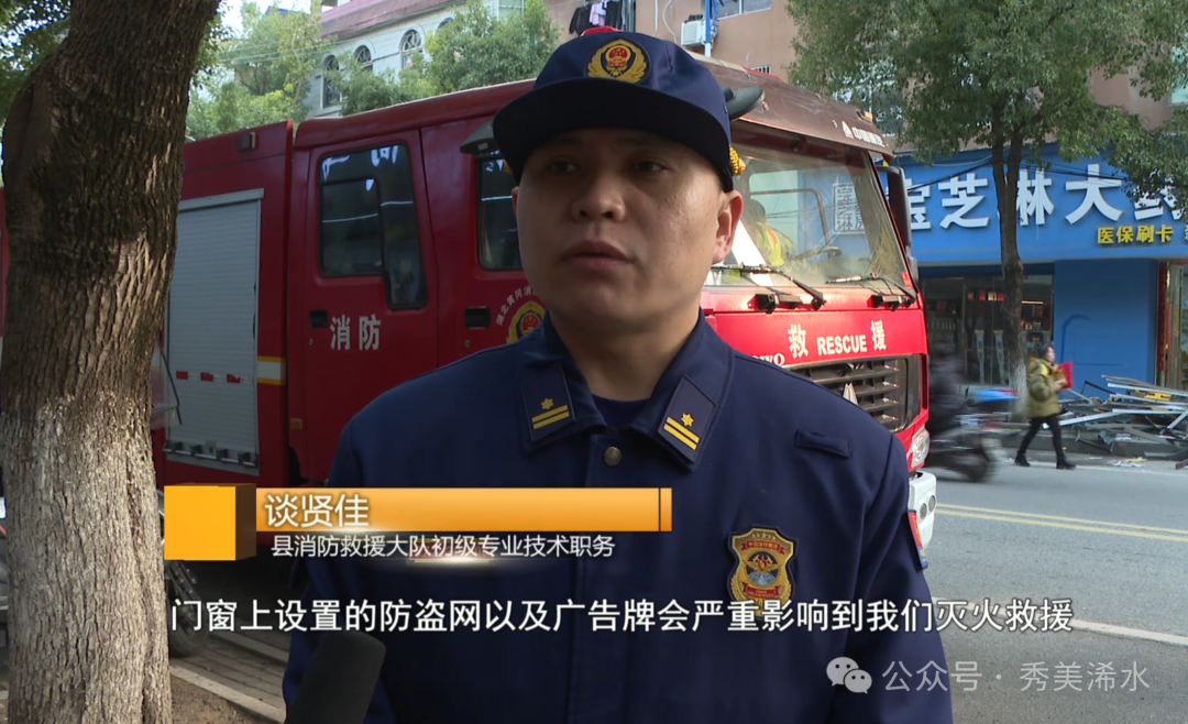 县消防救援大队初级专业技术职务 谈贤佳:此类场所一旦发生火灾,门窗上设置的防盗网以及广告牌会严重影响到我们灭火救援。当疏散通道被大火封堵时,墙外的窗口就是我们唯一的救援通道,如果被防盗网或广告牌遮挡,极易造成人员伤亡。在此,呼吁全县商户以及居民自行拆除影响疏散逃生和灭火救援的广告牌和防盗网。