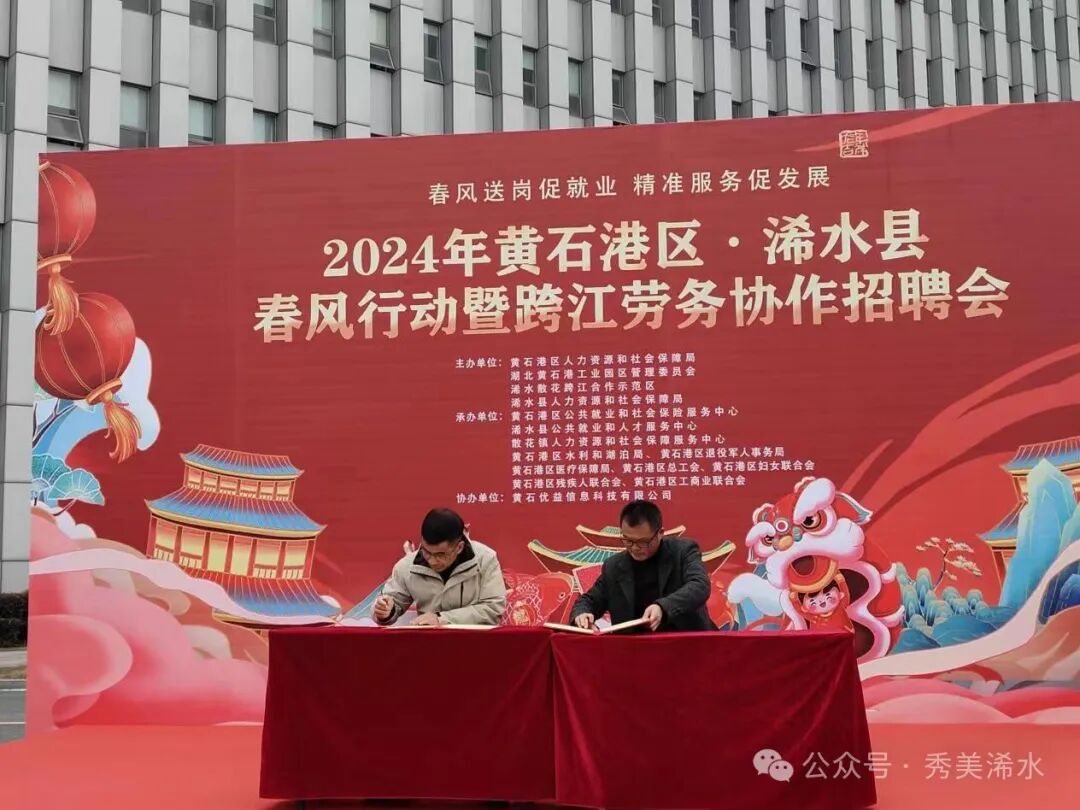 活动中,两地人社部门相关负责人现场签订劳务合作协议,双方表示将充分发挥各自优势,共同就招聘信息发布、劳动力输送、培训资源共享、校企合作、劳务纠纷维权、稳岗监测等方面进行合作双赢,共同推动实现浠水、黄石港区两地的优势互补、资源共享、互惠共赢、协同发展。