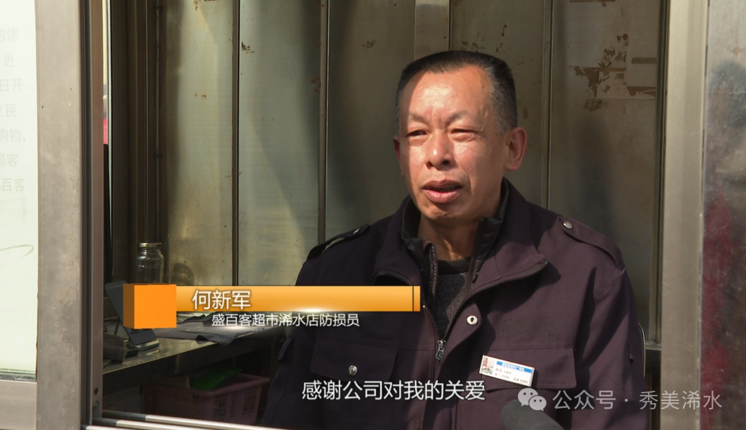 盛百客超市浠水店防损员 何新军:我腿脚不是很方便,在这不累人,回家只要五六分钟,也养得了自己,在这上班感觉到了公司对我的关爱。