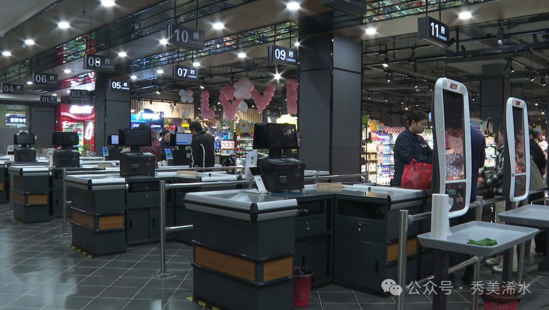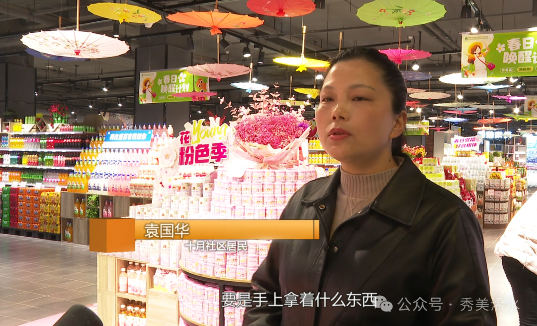 十月社区居民 袁国华:现在货品越来越多,什么都能买得到,都挺齐全的。要是手上拿着什么东西,没有购物篮、购物车,服务员会主动给你推过来,要是货品多的话,他们还给你推到服务台。氛围挺好的。
