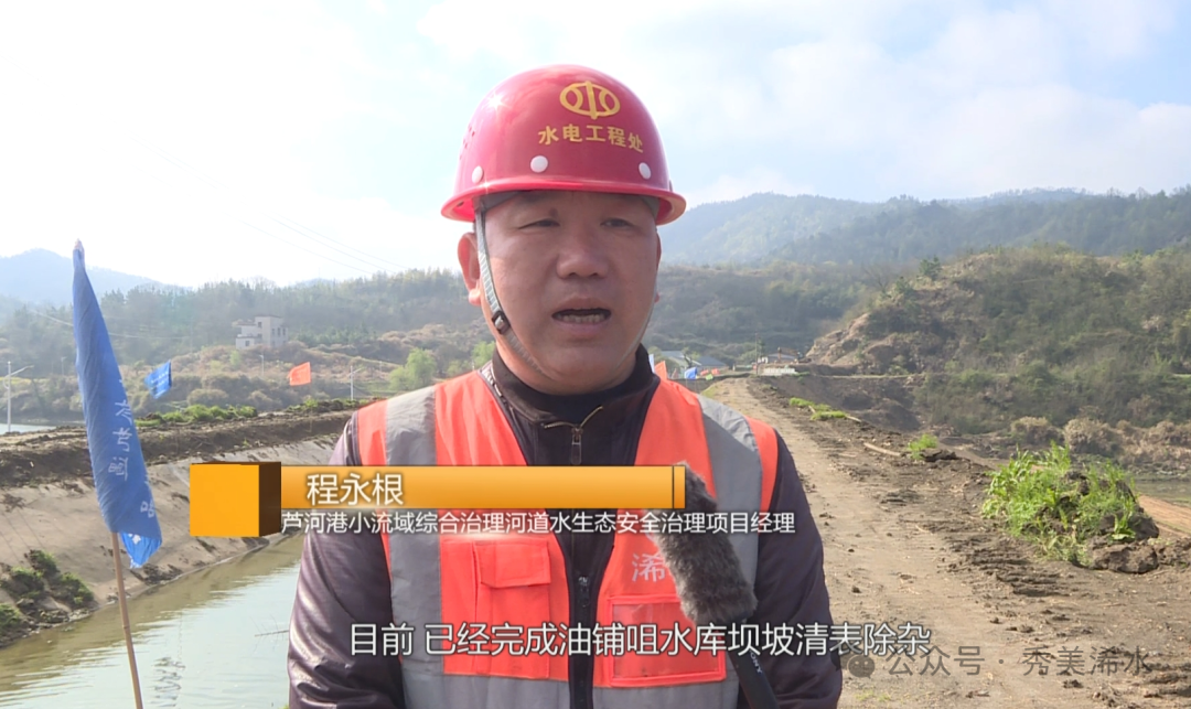 芦河港小流域综合治理河道水生态安全治理项目经理 程永根:目前已经完成油铺咀水库坝坡清表除杂、工程测量等相关工作,正在进行坝坡土方回填,坝坡整平、翻板坝建设。
