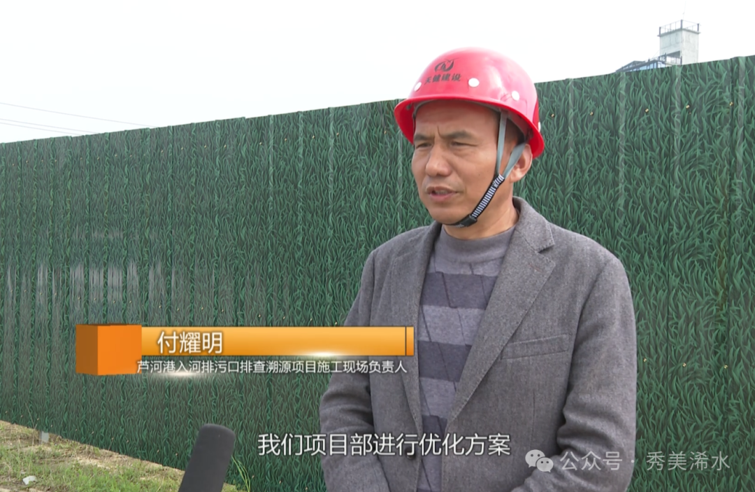 芦河港入河排污口排查溯源项目施工现场负责人 付耀明:我们项目部进行优化方案,从人、财、物进行缩短工期,抢晴天,战雨天,立体交叉作业,三班倒换人不换机械,确保如期完工。