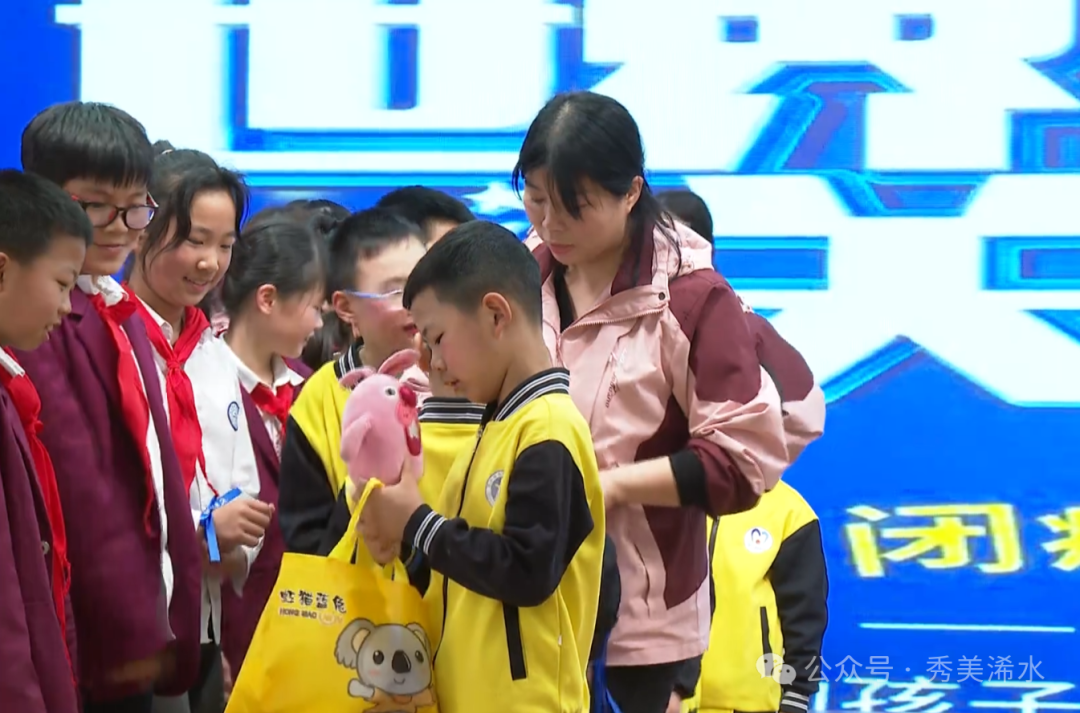 表演结束后,孩子们相互赠送了系在手上的蓝丝带和节日礼物。县实验小学学生还为梦琪儿童康复中心的学生送上了美好祝福,大家手牵手期待走向更美好的未来。
