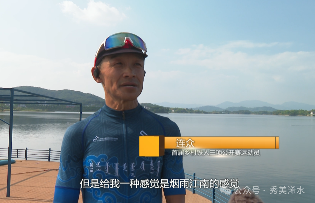 首届乡村铁人三项公开赛运动员 连众:山美水美,虽然天天下雨,但是给我一种烟雨江南的感觉,我上那赛道来看了一下,赛道特别美,政府也大力的支持这项体育运动,现修的路修得非常好,因为我是第一次来浠水,有很多当地的铁友约我在一起游泳、练赛道,一起跑步,非常好,特别热情。我住在县城,离文昌公园很近,早晨去跑步,在那地方风景特别秀丽,有一种古城的感觉,古色古香的,还有像那个像长城的建筑,特别美丽。