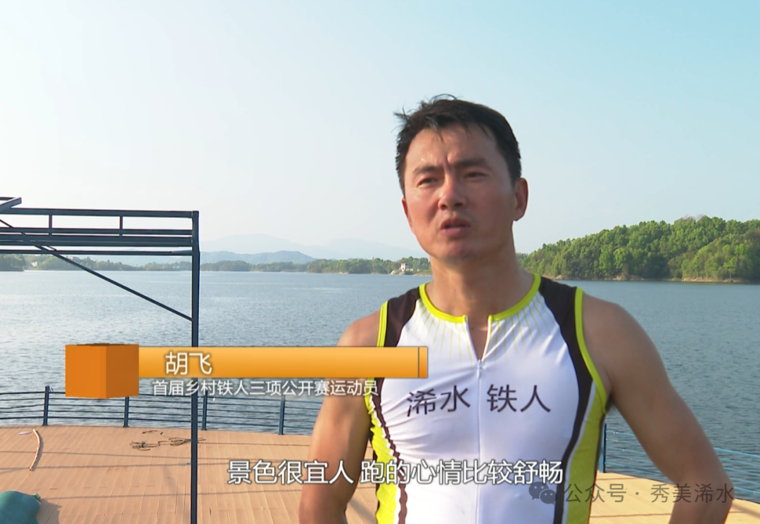 首届乡村铁人三项公开赛运动员 胡飞:柏油路面也很干净,两边的风景也很好。沿着左边是山,右边是白莲河水库,景色很宜人,心情比较舒畅。水质水温很舒服,我刚游泳的时候不小心喝了一口,我觉得这个水还是蛮甜的。