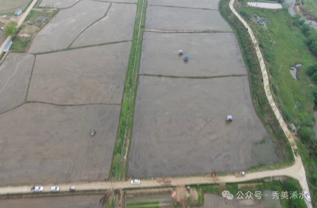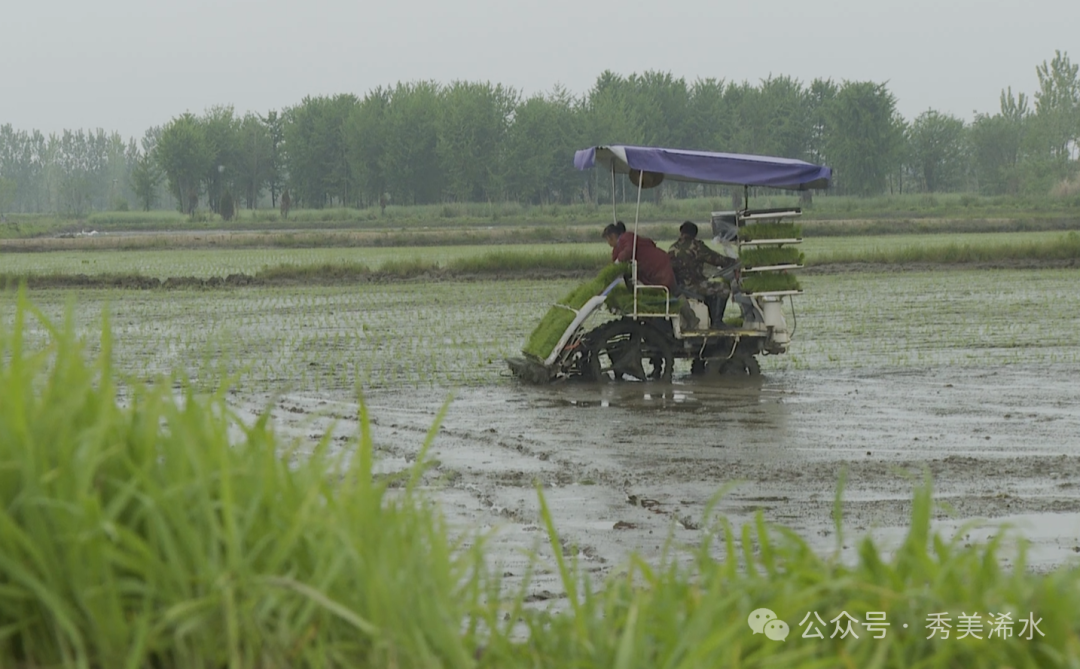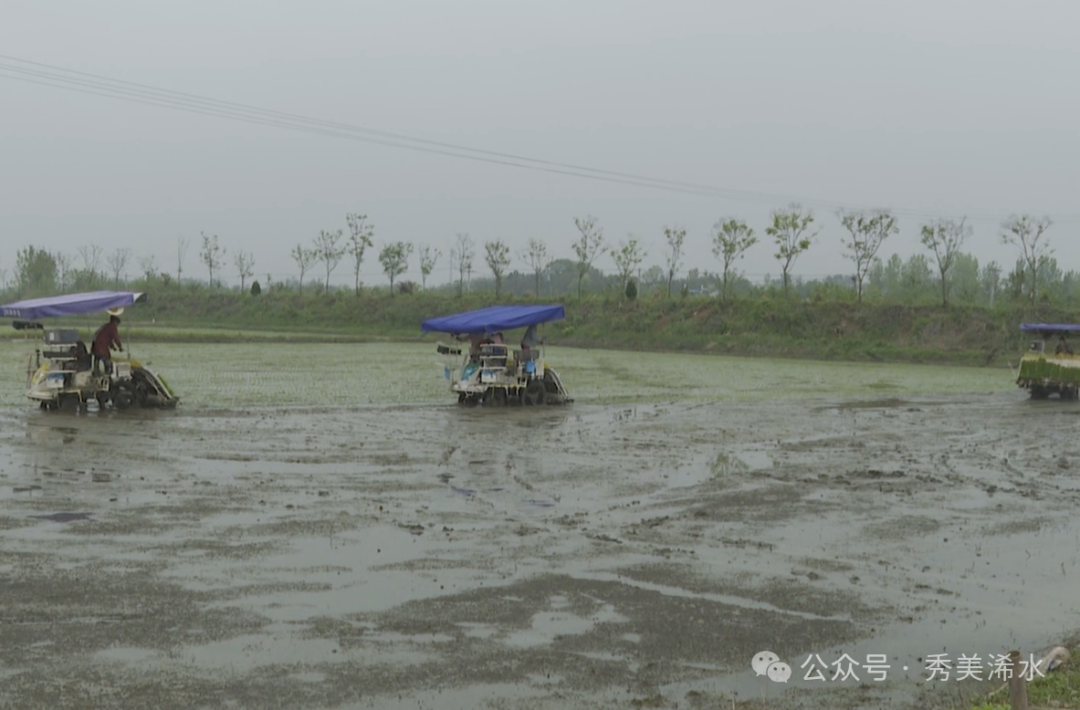 在汪岗镇庙陈庙河流域的嘉丰农业有限公司,今年流转农田3000多亩,计划种植双季稻1500亩,3月底,已经通过植保无人机,直播早稻500亩,今天开始启动1000亩早稻机插,5台插秧机正在抢时作业。