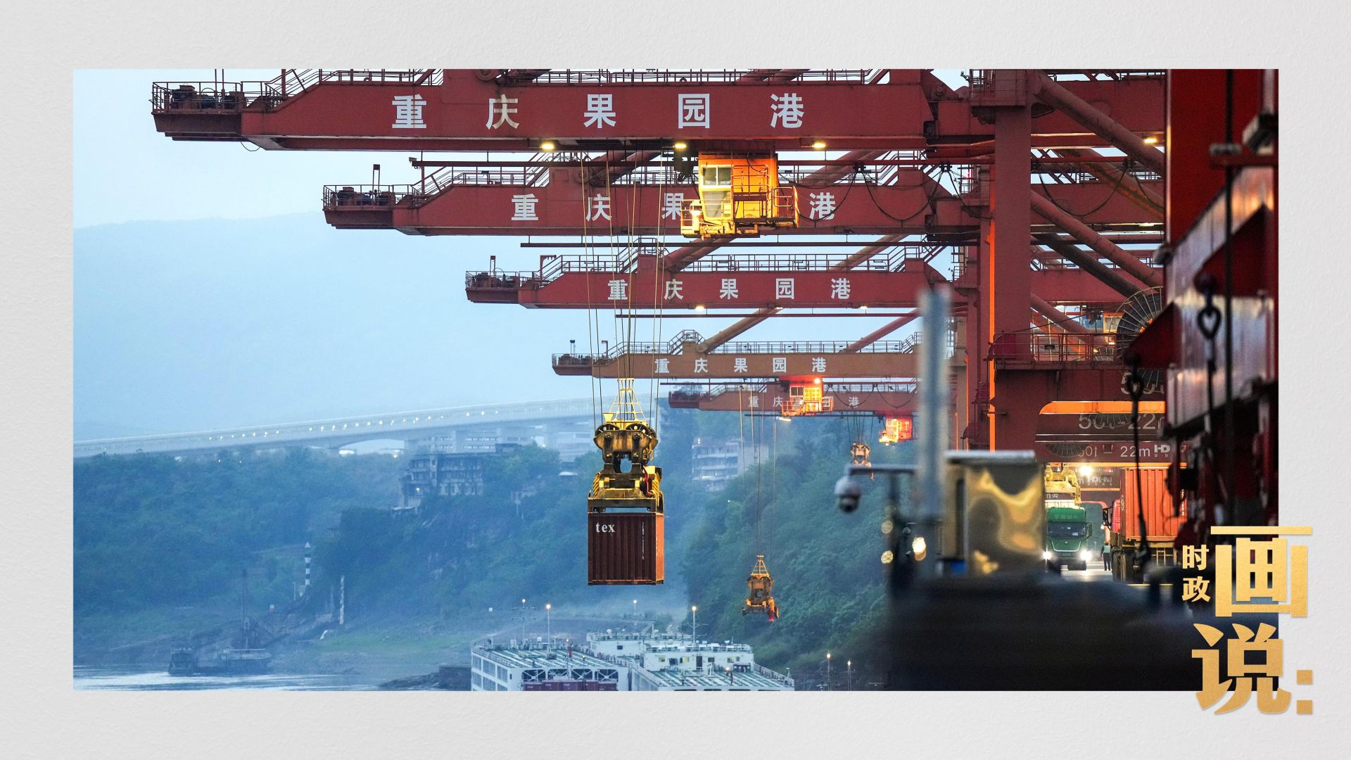 △果园港沿江码头平台上,大型岸桥正在向滚装轮上装载货柜。两江新区,重庆。