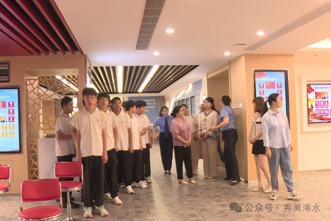 活动中,县实验中学学生参观了12309检察服务中心、晨曦未检工作室和院史馆等地,学生在模拟法庭进行了角色体验,沉浸式体验了庭审过程,了解检察院职能,感受法律的力量。