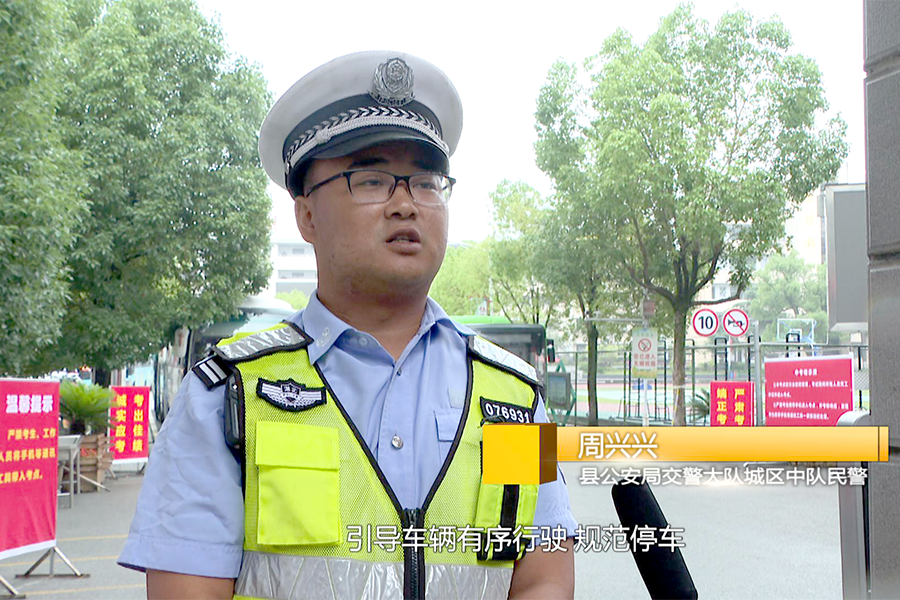 县公安局交警大队城区中队民警 周兴兴:为全面做好2024年中考交通安保工作,中考期间,我们在实验初中考点安排执勤警力20余人,提前到岗到位,对考点周边施行临时交通管制,引导车辆有序行驶、规范停放,提醒经过考点附近的车辆减速慢行,禁止鸣笛,为广大考生营造一个良好的交通环境和考试环境。