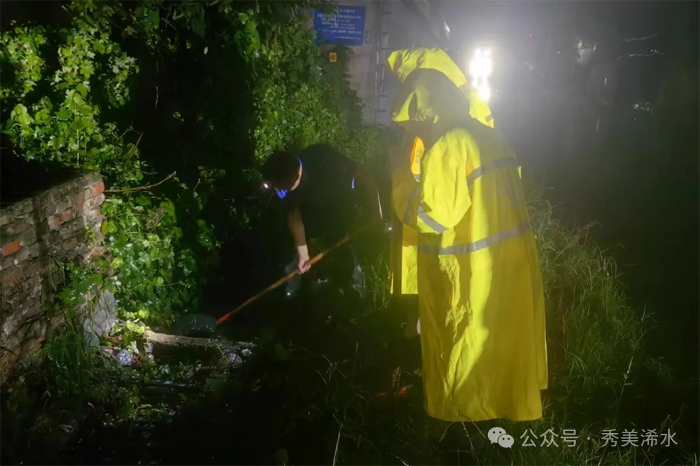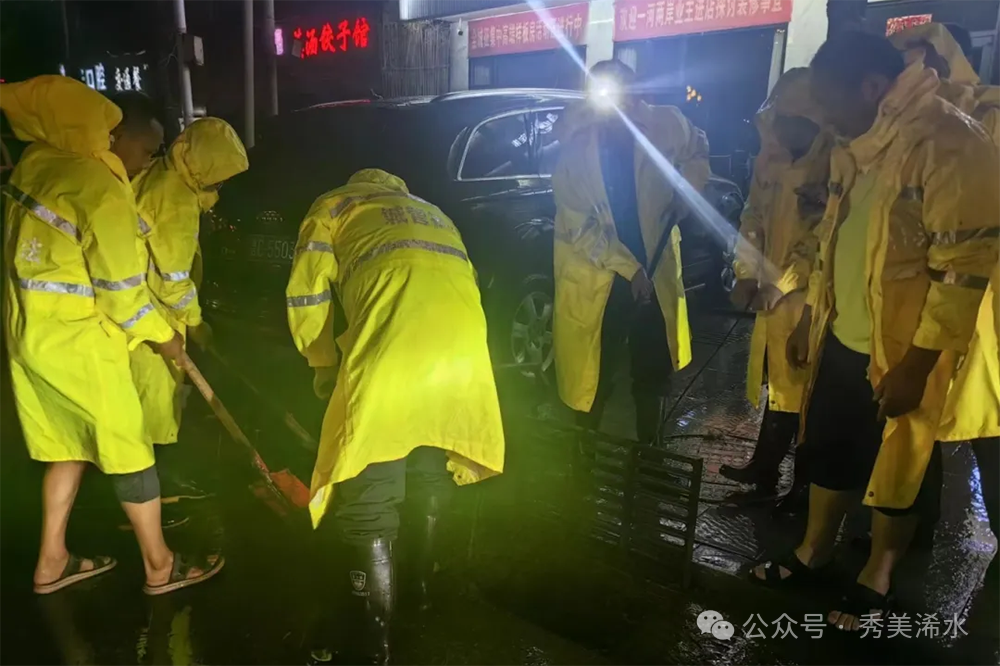 在铁路桥涵洞、彩虹大道天泽路、丽文广场、车站路润达门口等城区各个易积水点及各中考考点门口,队员们整夜坚守,与暴雨赛跑。当积水过多时,队员们在污水中徒手清掏雨水篦子,打开井盖套上防护网,适时利用水泵进行抽水作业。在已发生积水的区域设置警示牌,提醒过往群众和车辆安全、有序通过。