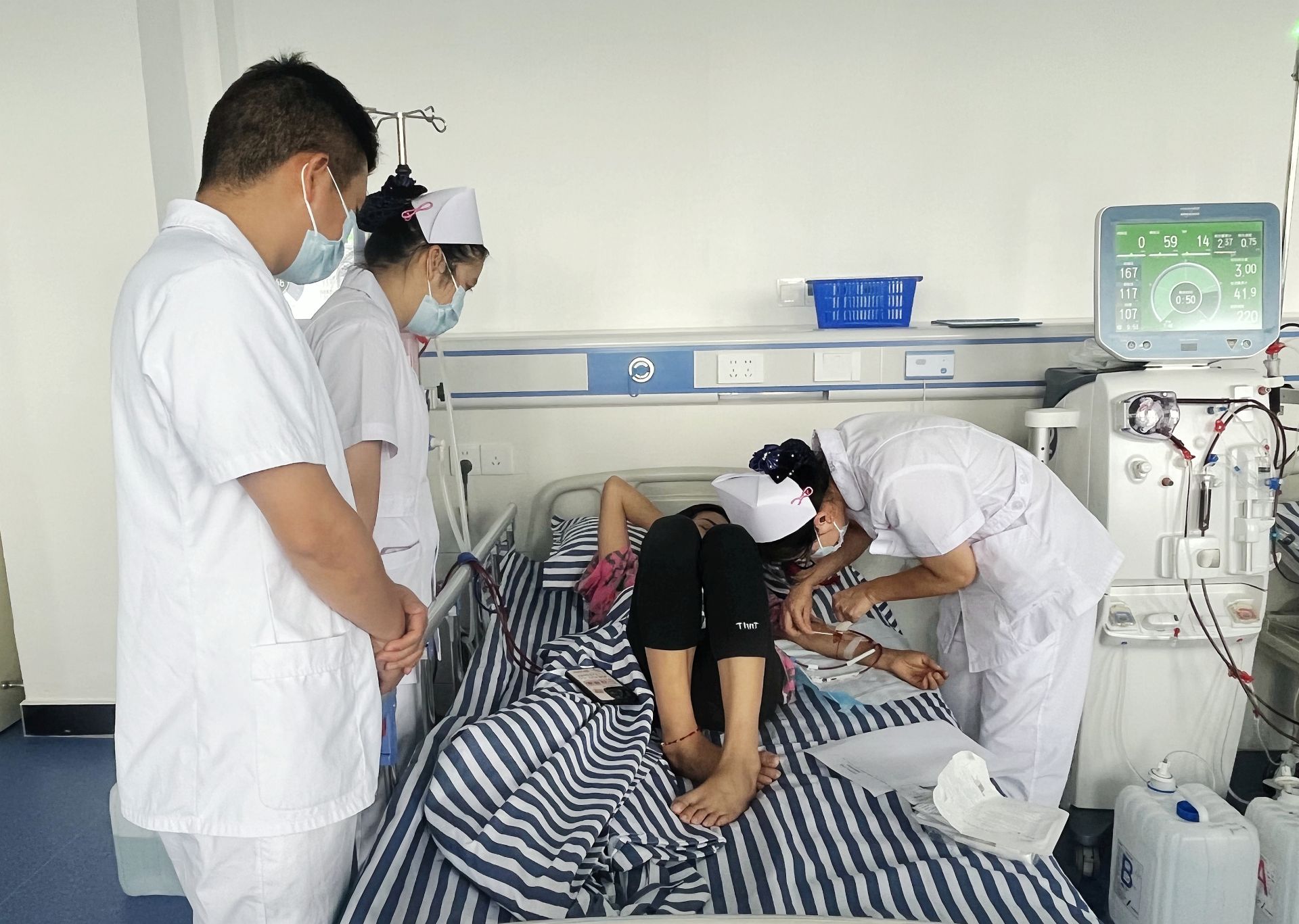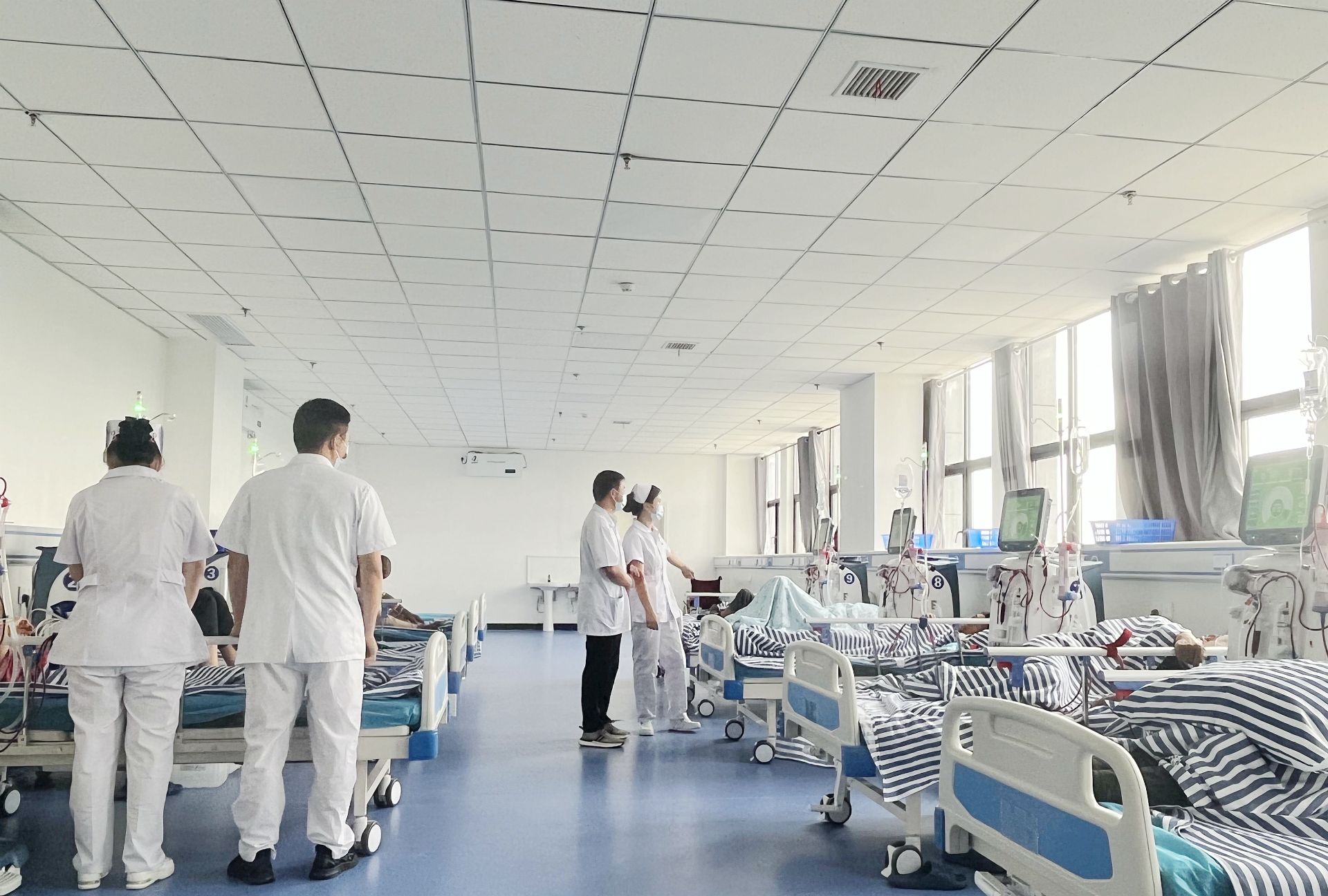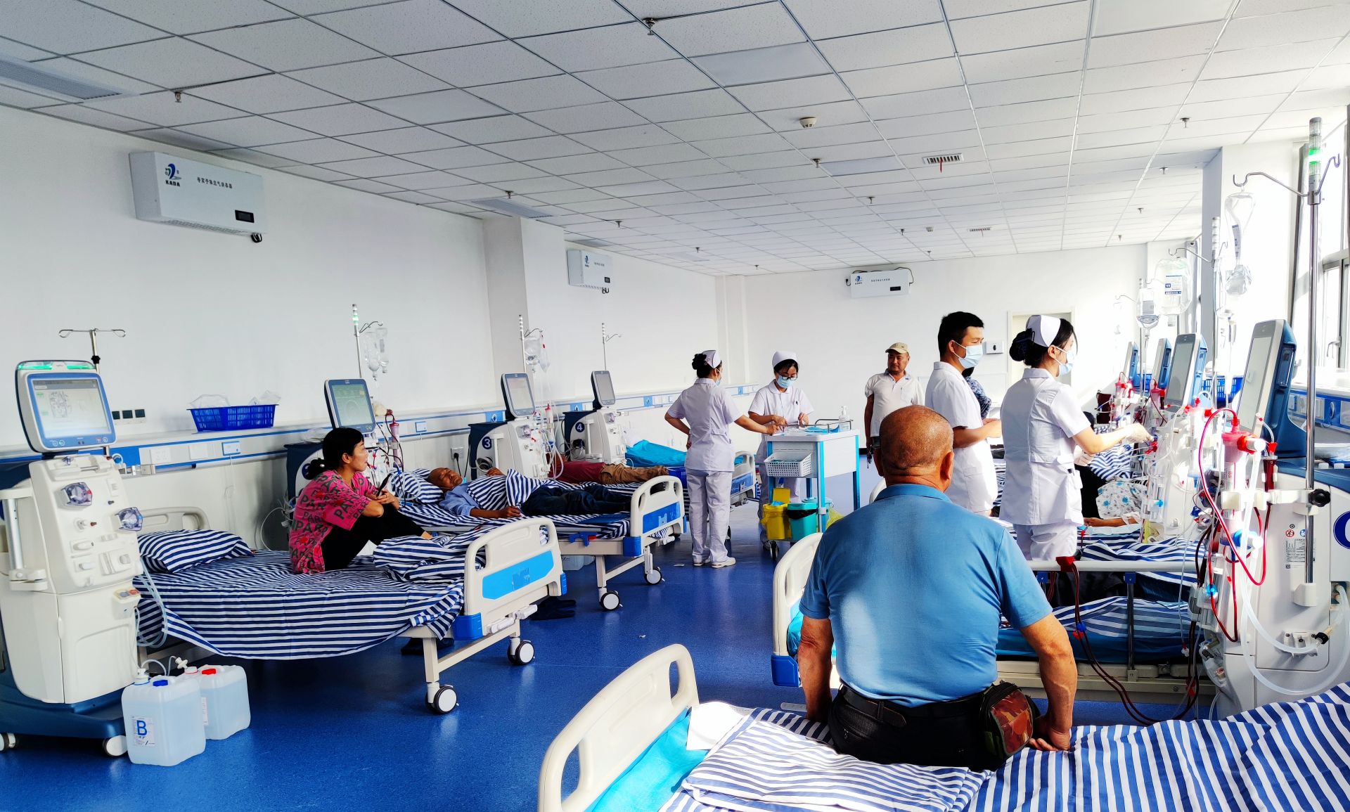 该院血液透析室是在6月24日开科运行的,病区环境宽敞明亮舒适,现配置有9台先进的血液透析机和一套高端制纯水设备,同时安排有9名医护人员专职负责血液透析工作,每天可以接受18名肾病患者进行血液透析。