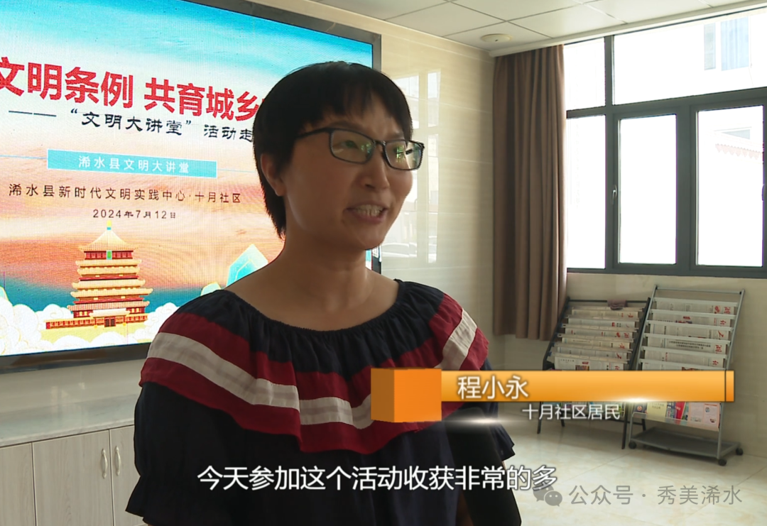 十月社区居民 程小永:今天参加这个活动收获非常的多,通过这里面讲的扫黄打非、防溺水、防反诈宣传,这些城乡文明建设,对我来说都是收获非常的丰富,学到了非常多的东西,让我大开眼界,受益匪浅。