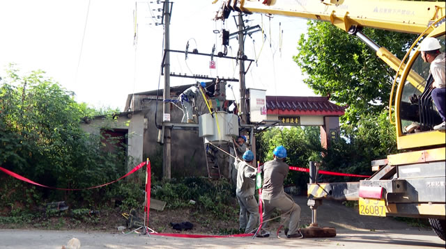 7月25日清晨,在丁司垱镇靖平村2号公用变压器更换施工现场,电力作业人员正忙着吊装变压器,铆足干劲尽快完成低电压治理任务。