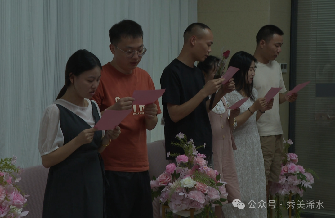 颁证鉴证齐相同,新人共祝誓言洪。县婚姻登记中心也向每一对新人发出倡议,破陈规、除陋习、传文明、树新风,提倡婚事新办、喜事简办,做文明新婚俗的倡导者、践行者、推动者,共同弘扬好风气。县婚姻登记中心分批次为新人举行集体颁证仪式,让新人们一起宣读结婚誓言,让爱情在简约中更显珍贵,在文明中绽放光彩。