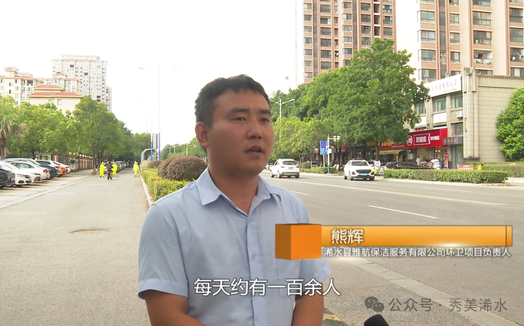 浠水县雅航保洁服务有限公司环卫项目负责人 熊辉:每天约有一百余人上班,工作时间分为两班倒,早上一班下午一班。高温天气我们定时的给工人进行防暑药品的发放,还有进行凉茶的发放。