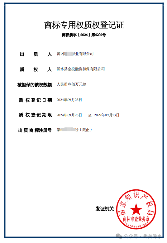 近日,浠水县金投融资担保有限公司(以下简称“金投担保”)成功办理首例商标知识产权质押融资业务,以企业注册商标为质押物,争取到了300万元的融资支持,并顺利获得国家知识产权局颁发的《商标专用权质权登记证》,实现了浠水县商标专用权质押融资零的突破,为广大中小微企业及“三农”企业开辟了全新的融资渠道,有效缓解了企业融资难题。