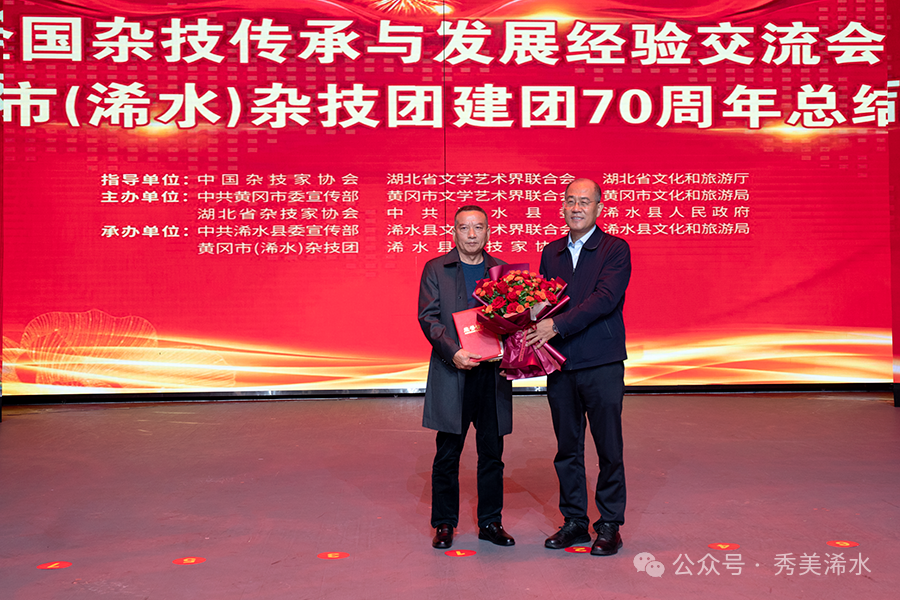 中国杂技家协会分党组书记、驻会副主席唐延海,省文联党组成员、秘书长张海旺,市委常委、宣传部部长李初敏,县委书记陈正红,市文联党组书记、主席叶大军出席会议,并为浠水杂技团建团70周年突出个人贡献奖、光荣在团50年个人、突出贡献合作单位、浠水杂技先进个人、浠水杂技之家称号获得者颁奖。县委副书记、县长邓中麟主持总结大会。