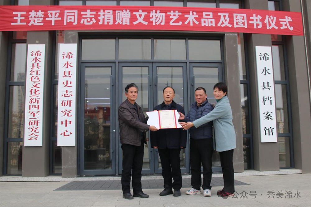 12月27日上午,黄冈市人大常委会原副主任、红色文化(新四军)研究会会长王楚平向浠水县档案馆无偿捐赠徐寿辉天完国政权钱币、闻一多手札58通以及其个人主编主纂的各类著作等,捐赠资料跨越百余年,具有极高的历史和文化研究价值。浠水县档案馆对王楚平同志的捐赠表示衷心的感谢,并向王楚平同志颁发了《捐赠证书》。