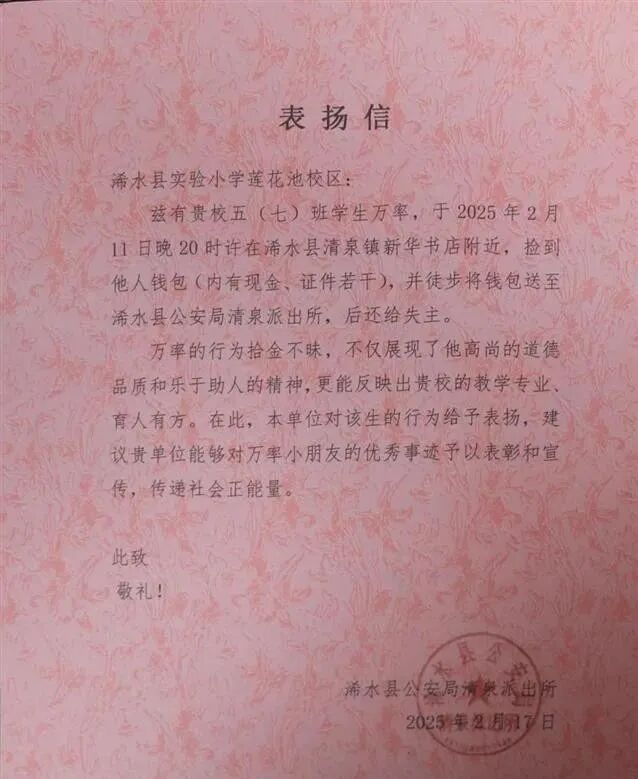 近日,浠水县公安局清泉派出所发出一封表扬信,表扬对象是浠水县实验小学一名11岁的小学生万率,信中称赞他拾金不昧的行为“展现了高尚的道德品质和乐于助人的精神”,并建议学校对该生给予表彰和宣传,以“传递社会正能量”。2月22日上午,清泉镇派出所副所长李初萌接受极目新闻记者采访时介绍,为了及时将失主的钱包送到派出所,万率同学徒步走了三公里多,错过了看烟花的时间。