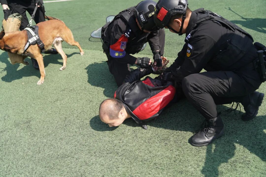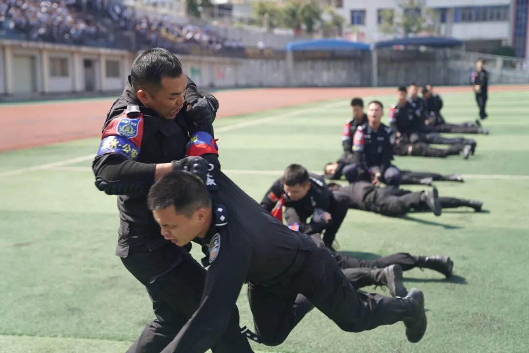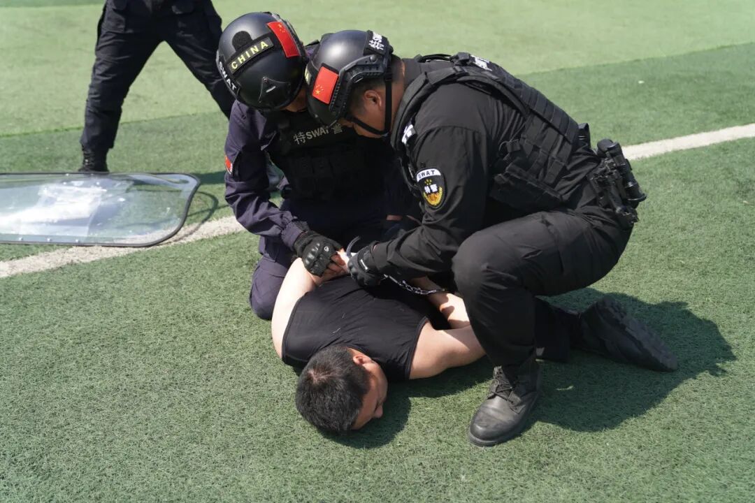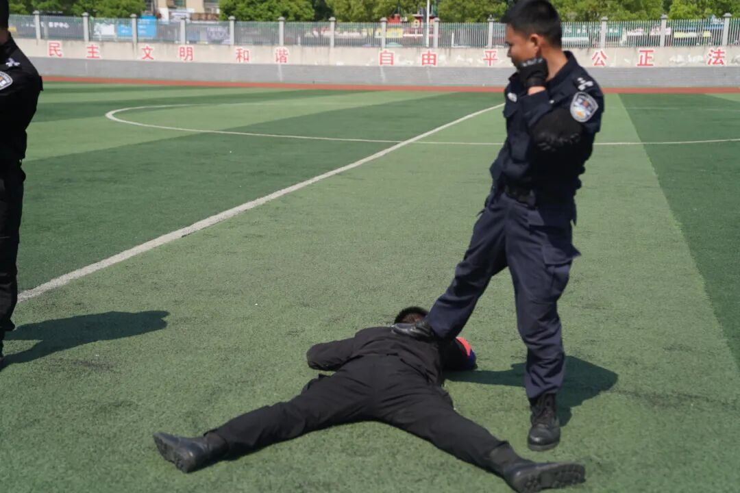 此次演练在巡特警大队控制技术专项演练中拉开帷幕,巡特警大队警员向广大师生展示了跪地控制、拉肘别臂控制、锁喉摔控制以及切别摔控制等精彩实战动作,赢得了师生们阵阵掌声和欢呼。