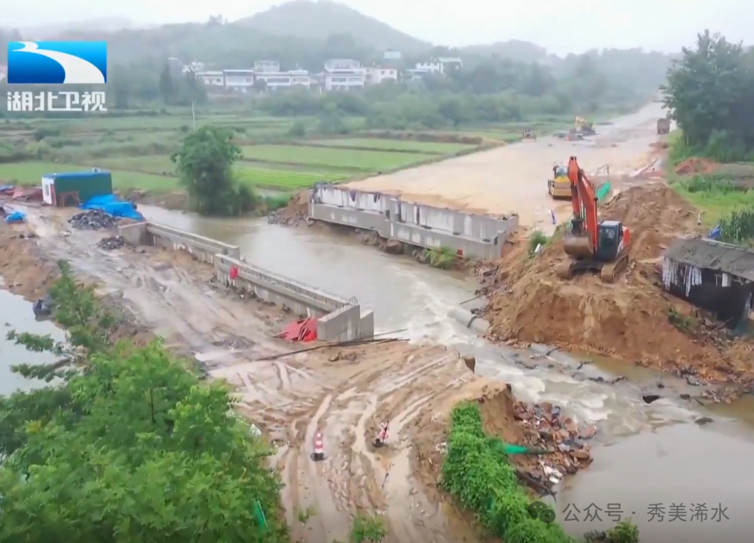记者胡文超在现场介绍:“我所在的位置,是浠水县清泉镇新铺村,在我身后就是流经当地的新铺北河,就在前不久当地正在河道上修建一个像我手机上的这张照片显示的跨河的便道,目前被冲垮的这个河道,宽度大约是20米,昨天晚上当地抢险人员连夜对这里进行了抢修。目前,河水还有一点湍急,但是相比于昨晚水势有所减缓。”