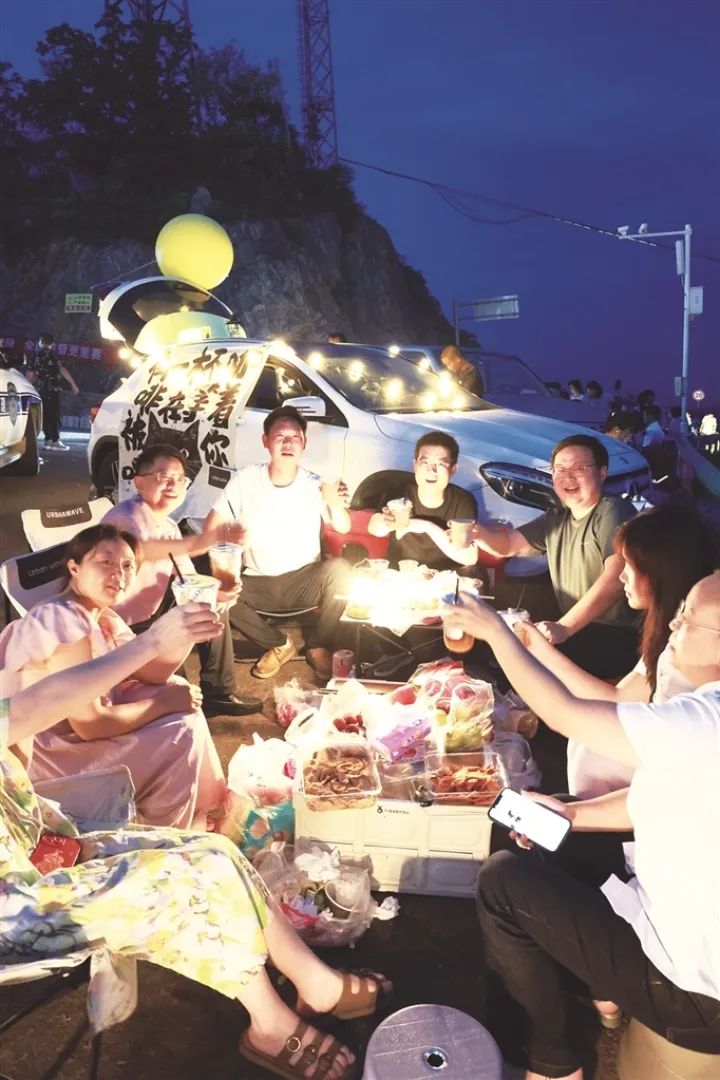 7月6日晚7点,夜幕刚垂,前往圣境山的山路上,私家车已排成长龙,夜市摊的烤串香、咖啡香混着山风飘远,市民们围坐聊天,笑声顺着山势蔓延。