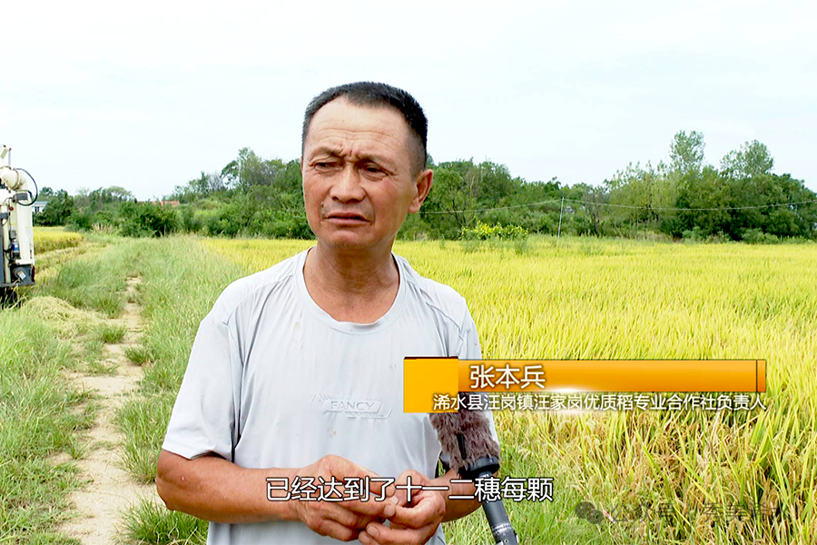 浠水县汪岗镇汪家岗优质稻专业合作社负责人 张本兵:我今年是第一年(种植),已经达到了十一二穗每颗,每亩(产量)达到1600斤左右,在同等的情况下是比较高产。
