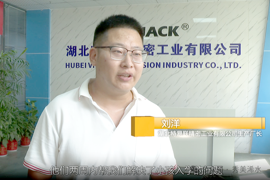 湖北特易联精密工业有限公司生产厂长 刘洋:他们两周内帮我们解决了小孩入学的问题,给我们省去了很多工作以外的烦恼。他们服务很周到,解决问题的速度也比较快,我们现在可以安心的在这里工作了。