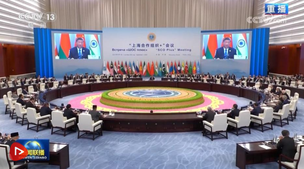 9月1日下午,“上海合作组织+”会议在天津梅江会展中心举行。国家主席习近平主持会议并发表题为《凝聚上合力量 完善全球治理》的重要讲话。