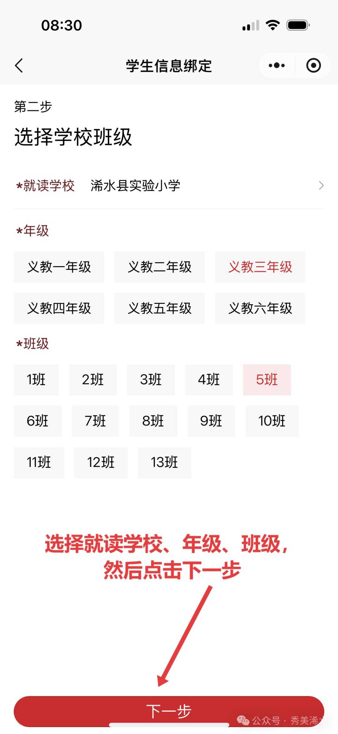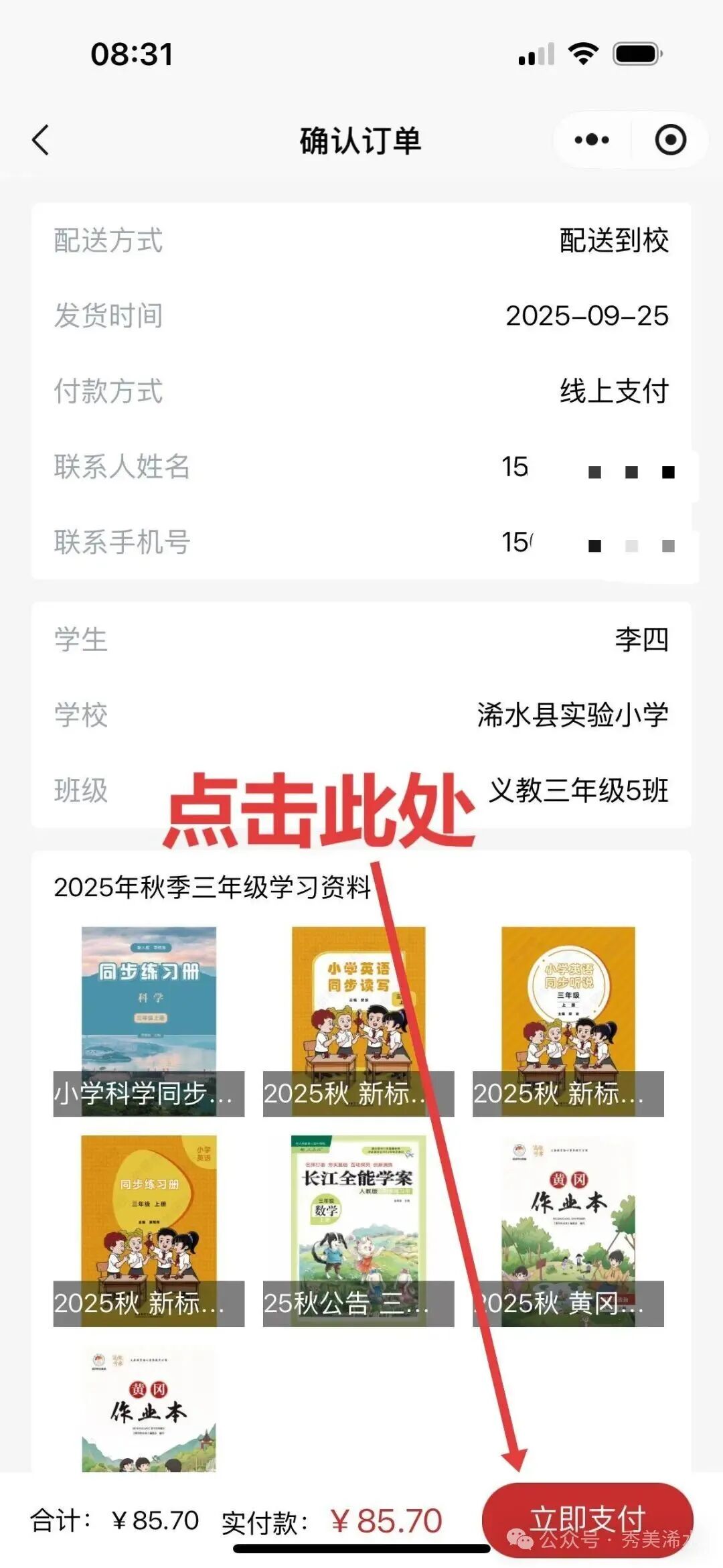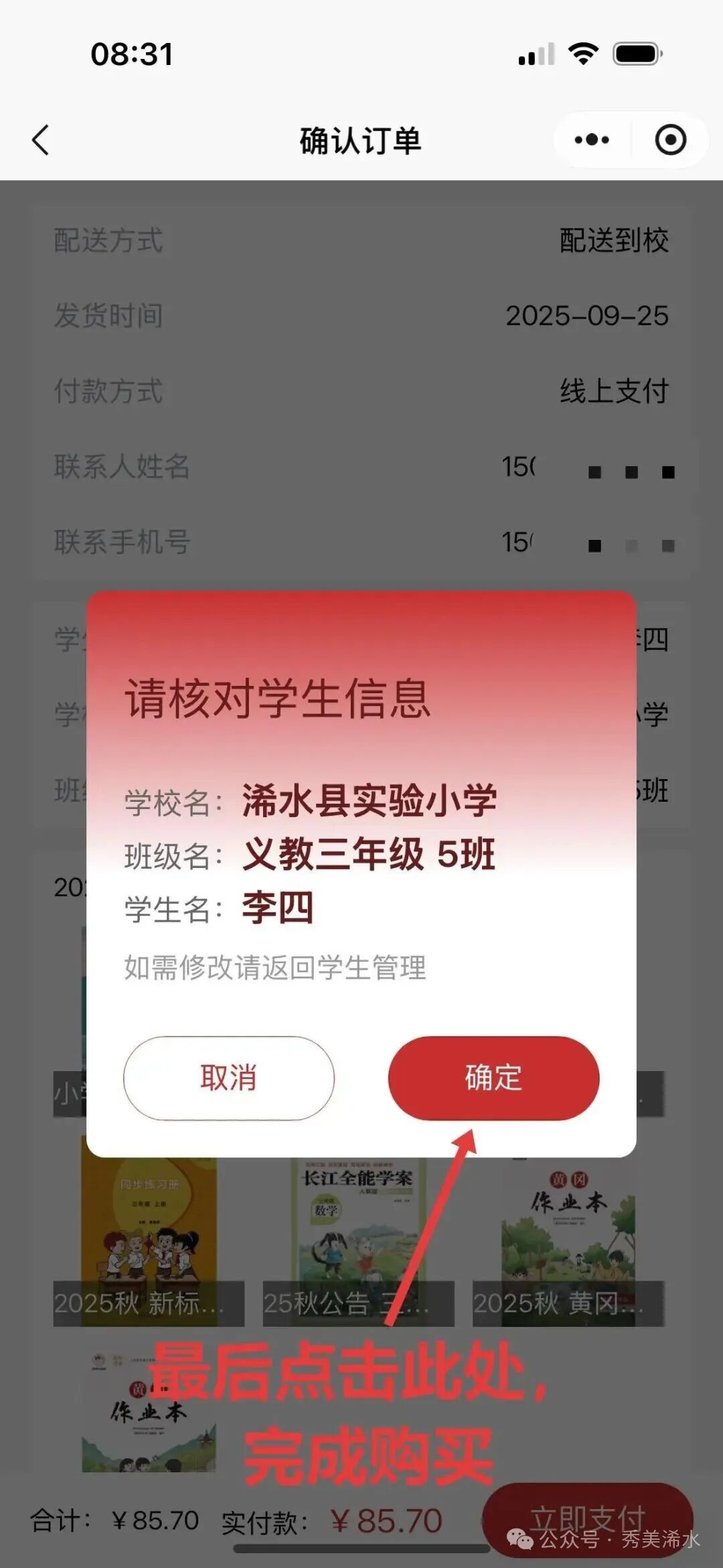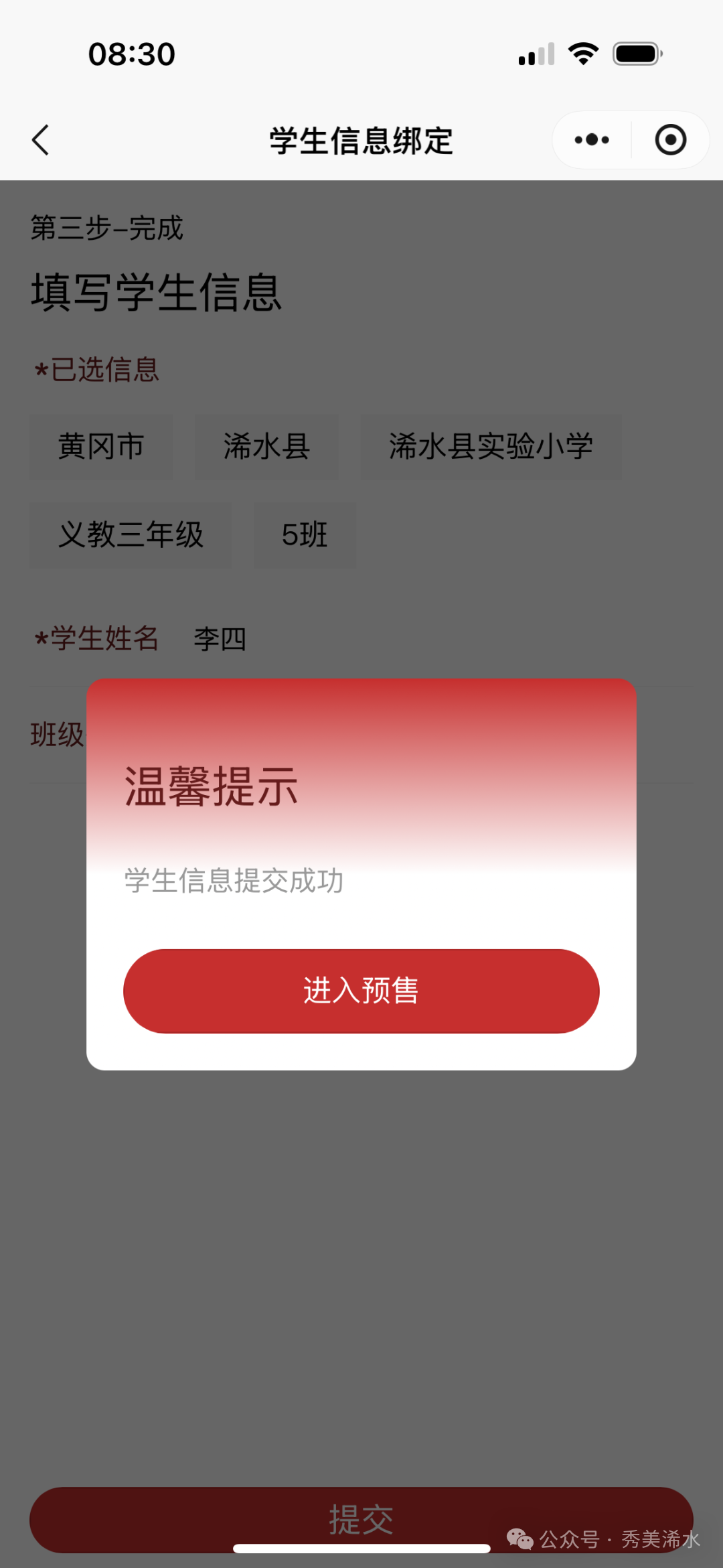 确认就读学校 →年级 →班级→姓名 → 点击提交→进入预售