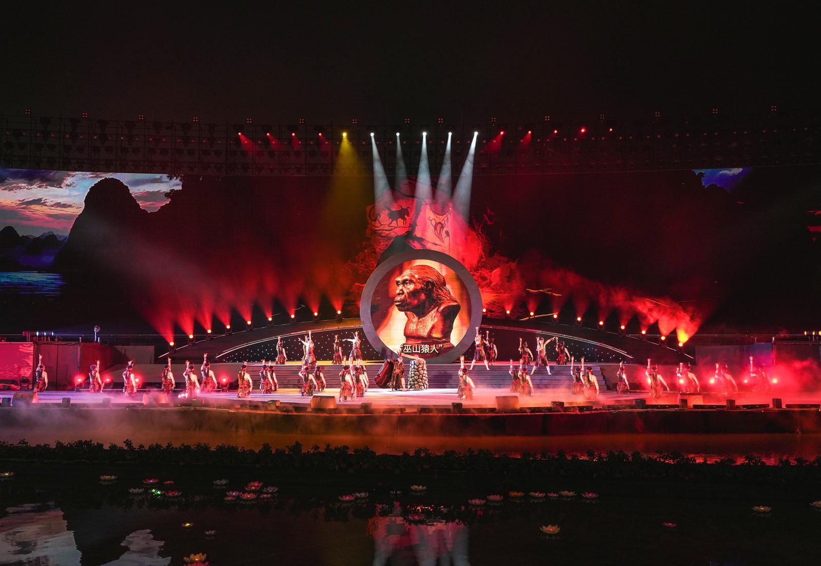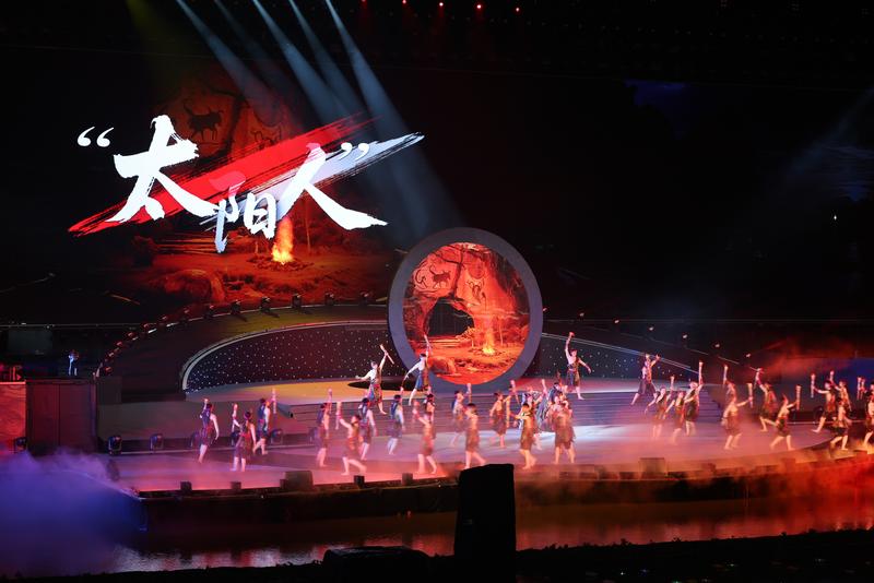 灯光渐隐,时空回溯,观众遁入苍茫远古。“巫山猿人”“长阳人”“太阳人”石刻等依次登场。创意舞蹈《太阳人》以时间为轴,舒展开长江三峡的文明史诗。
