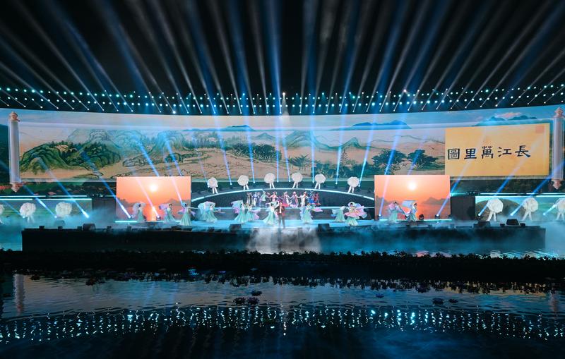 水幕之上,光影交错,《万里长江图》缓缓铺展,呈现浩荡江水、千年遗迹、时代新象。耳畔响起的经典之作《三峡情》,熟悉的旋律,却平添了些许新韵味。