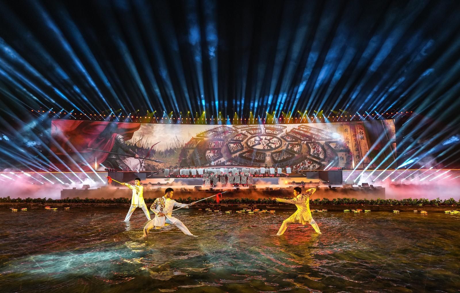 水上舞台,波光粼粼。前区,白衣武者执矛起舞,刚柔并济;中区,铠甲舞者持盾列阵,气势如虹。空中,无人机群与舞台默契呼应,变换出古老神秘的“八阵图”,再现诸葛亮运筹帷幄、决胜千里的智谋传奇……