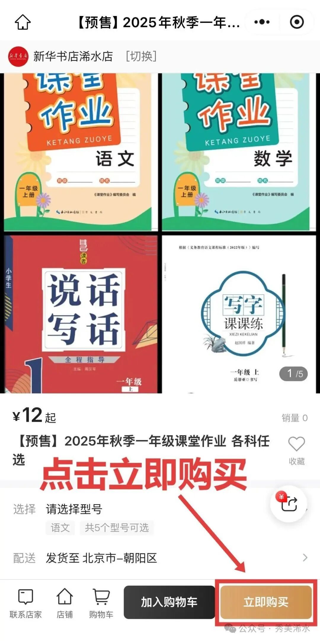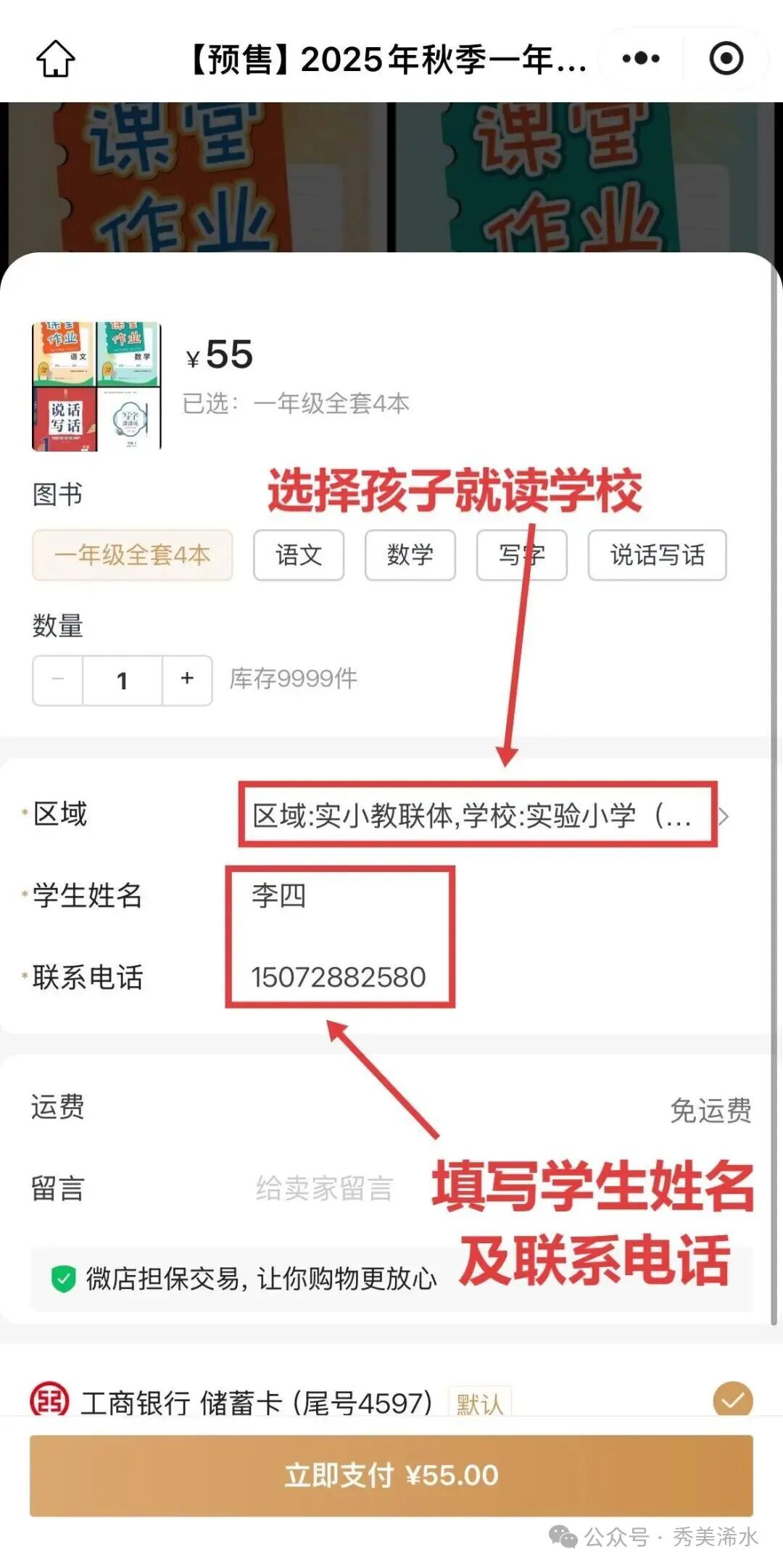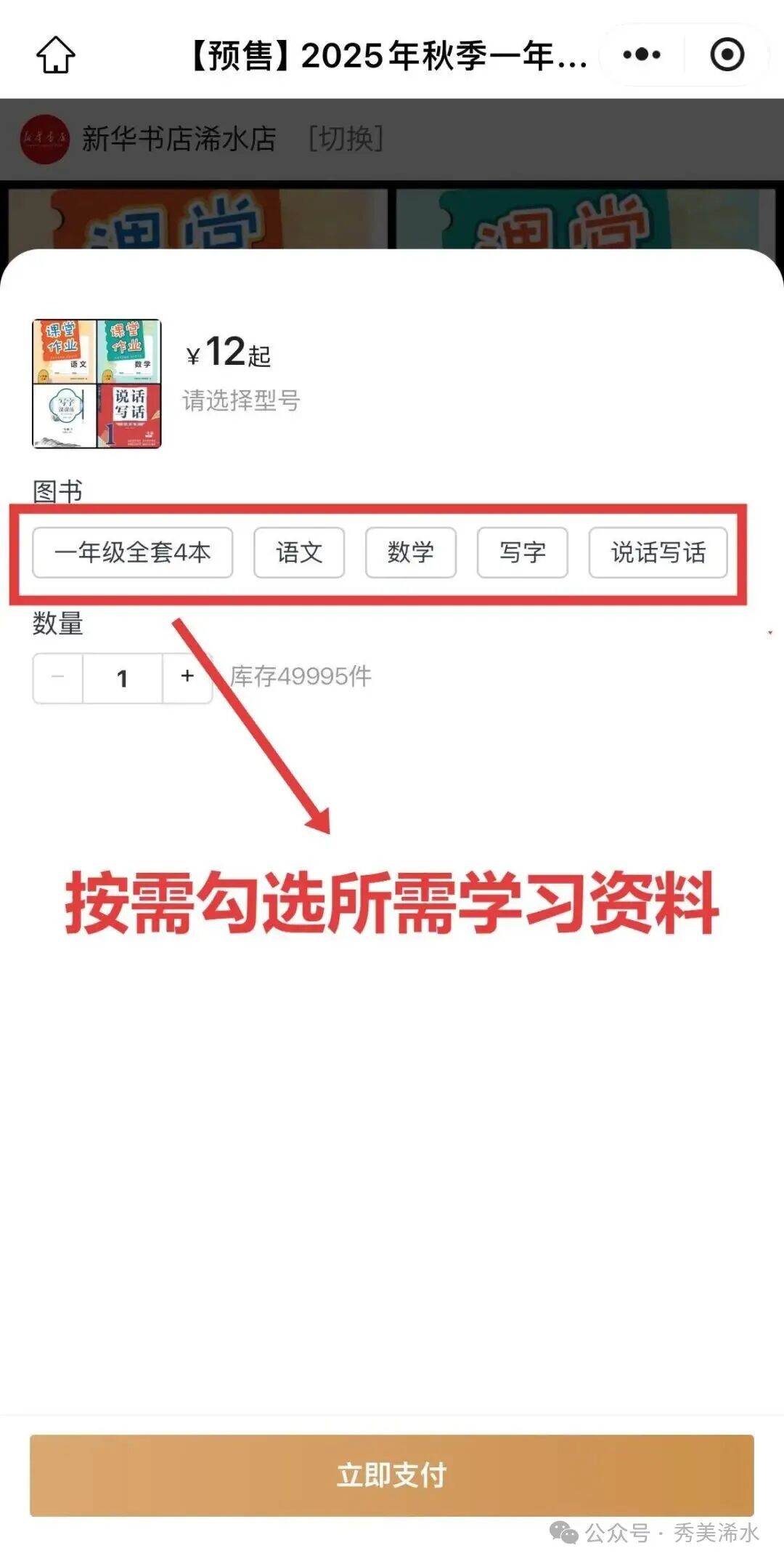 扫孩子所在年级二维码进入微商城 → 点击立即购买 → 按需勾选所需学习资料 → 选择孩子就读学校 → 填写学生姓名及联系电话 → 立即支付