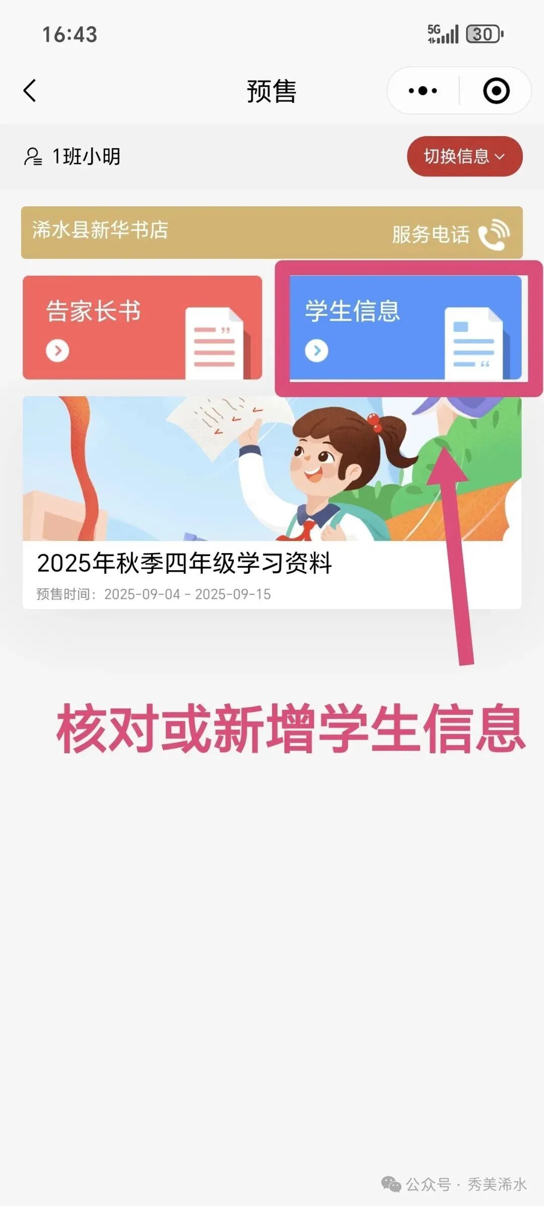 3.信息填写:请在下单购买时,准确填写孩子所在的“学校”“年级”“班级”。以及孩子的姓名,确保您的配送信息准确无误。如学生信息和实际信息不符合,请申请退款,再重新下单。