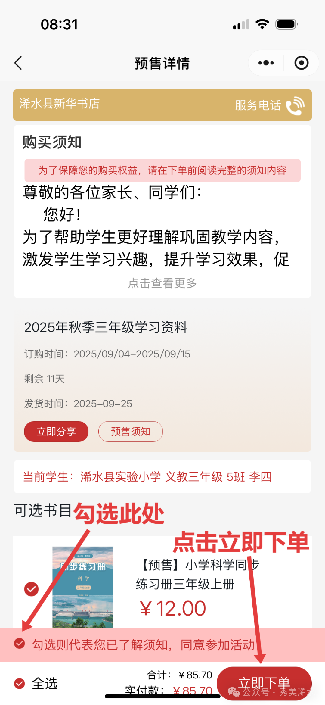 进入预售界面 → 点击学习资料 → 勾选须知并点击立即下单 → 点击立即支付完成购买