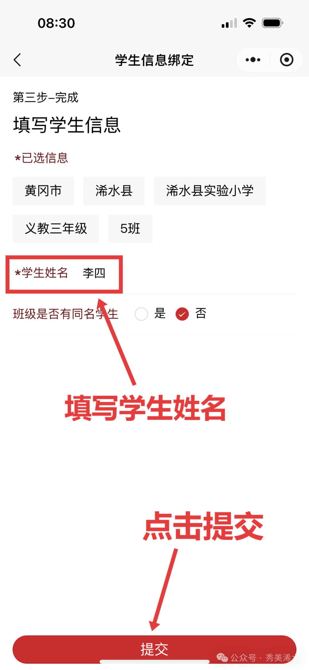 确认就读学校 → 年级 → 班级→ 姓名 → 点击提交 → 进入预售