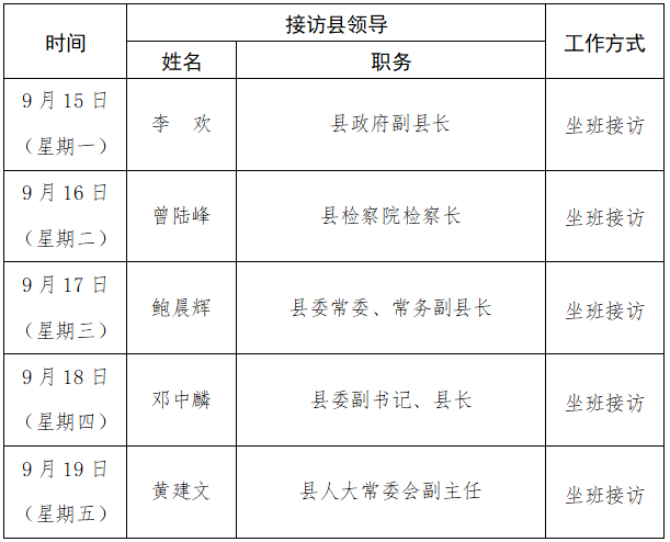 4.如遇县级领导工作冲突,县信访局将进行临时调整。