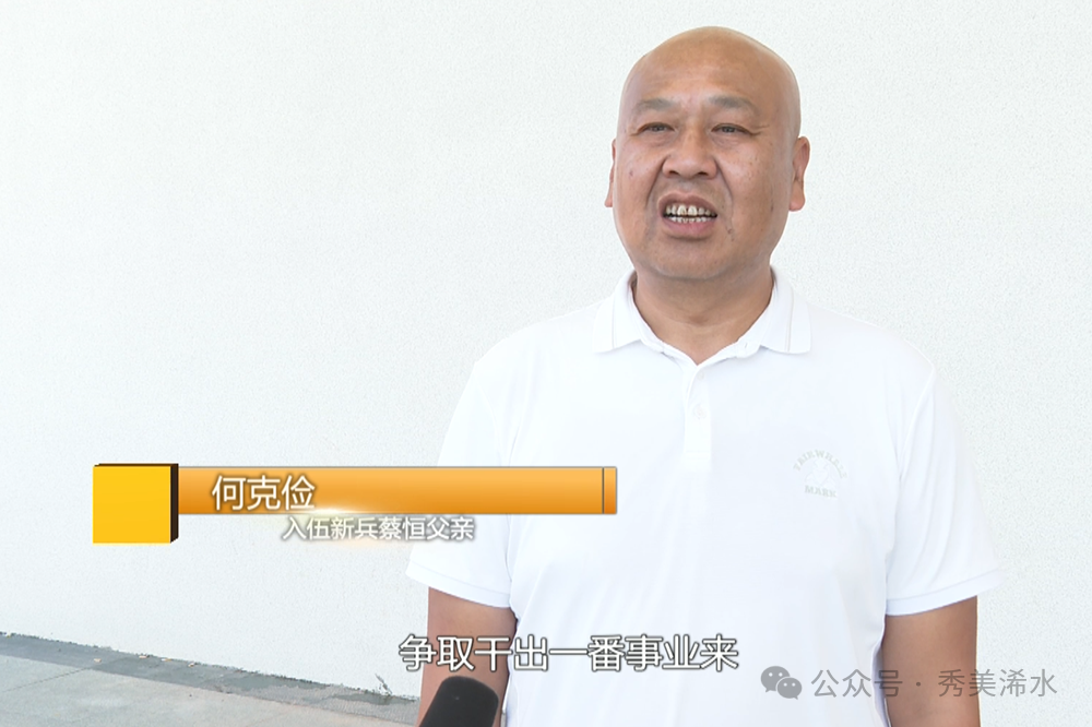 入伍新兵蔡恒父亲 何克俭:孩子二次入伍,我感到非常的高兴。第一次很不舍,第二次我感到很荣幸,坚决支持孩子二次入伍。希望孩子到部队之后好好地发展,刻苦学习,钻研专业知识,争取干出一番事业来。