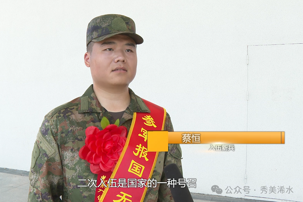 入伍新兵 蔡恒:二次入伍是国家的一种号召,加入党组织是我从小的梦想,参军报国也是我从小到大的梦想。二次入伍,我主要目标还是像谈颖同志一样参加阅兵,学到本领以后保家卫国。