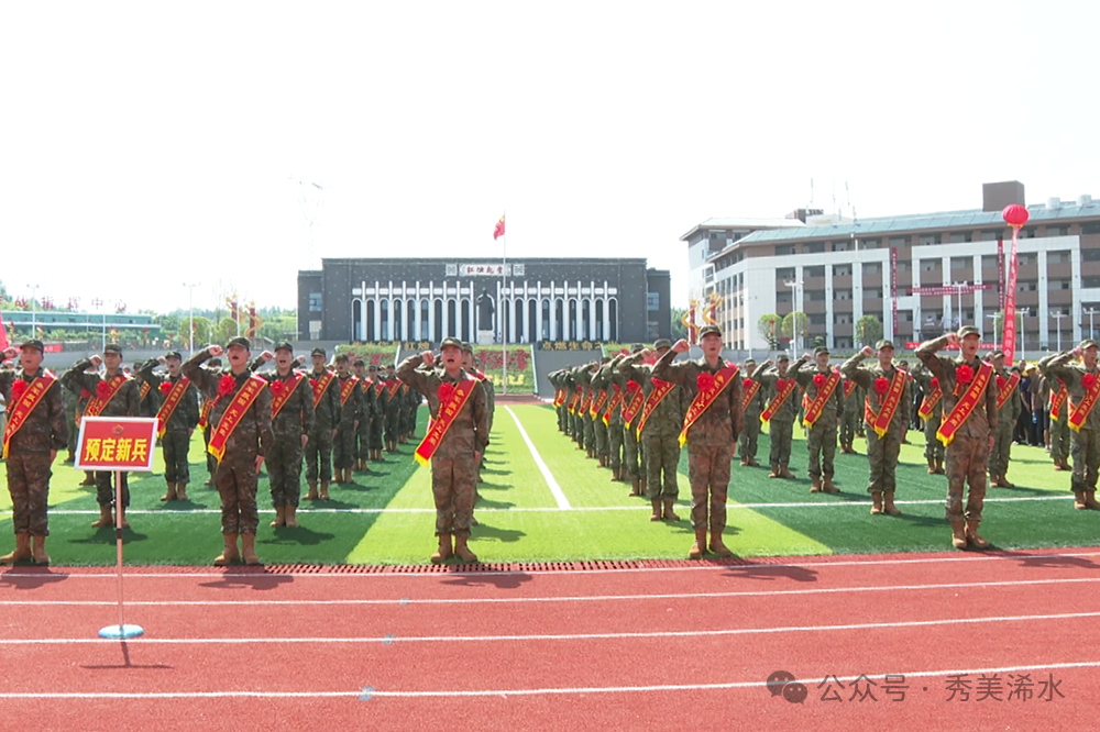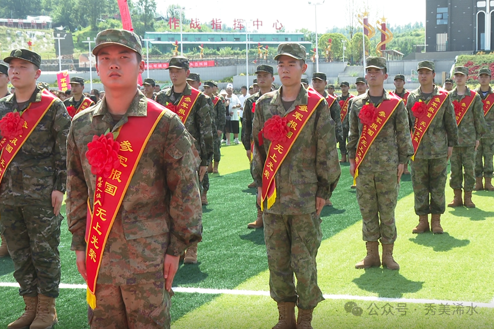 欢送大会在雄壮的国歌声中拉开帷幕,即将入伍的新兵们戎装整肃、胸戴红花,展现了新时代青年积极响应祖国号召、投身军营的家国情怀和责任担当。